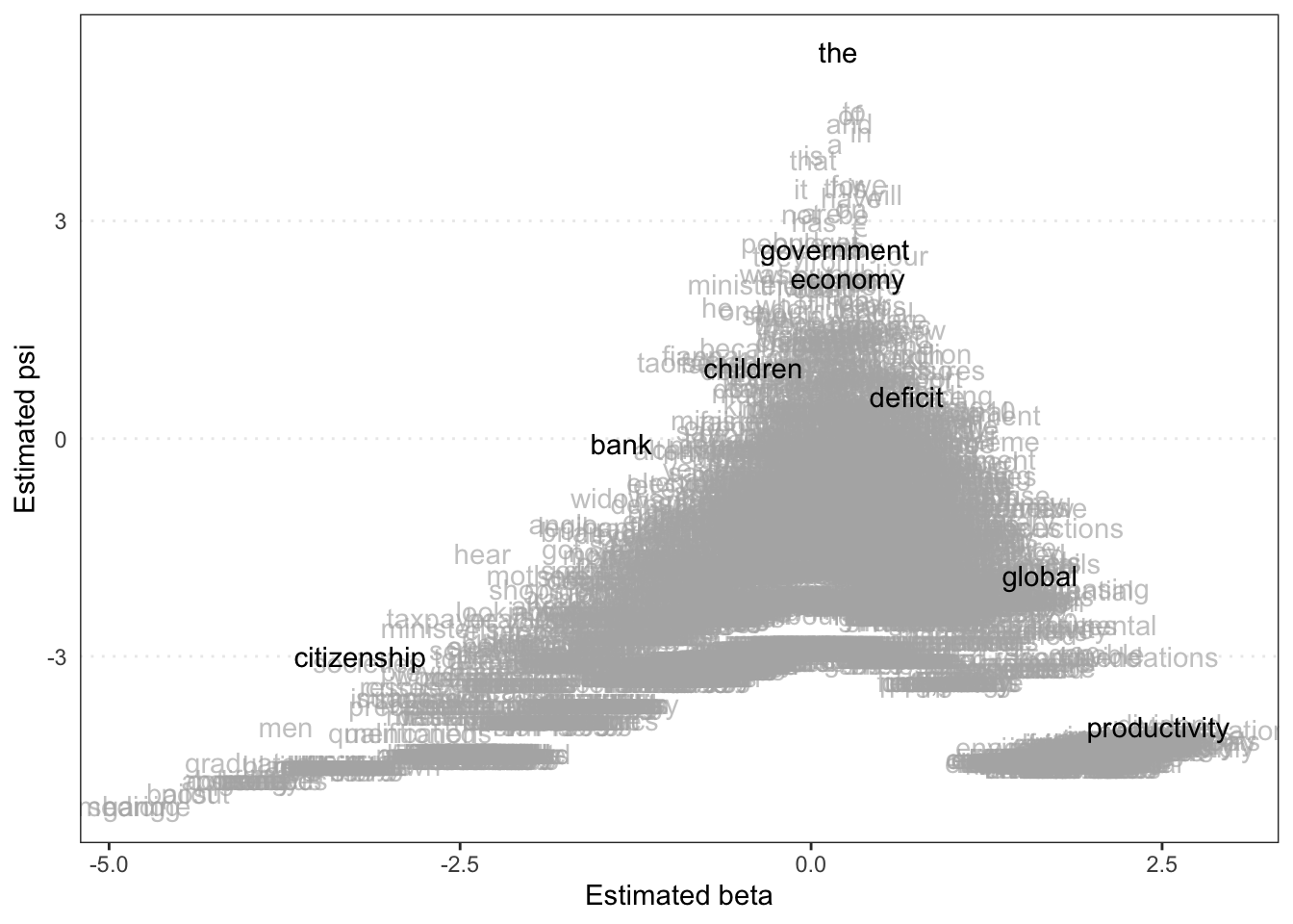 Podemos ainda visualizar a posição estimada das palavras (tokens) da nossa DFM, dando destaque para algumas selecionadas. O psi (\(\psi\)) estimado representa os efeitos fixos por palavra (estimated word fixed effects e o beta (\(\beta\)) estimado representa o efeito marginal (estimated feature marginal effects). Logo, são scores estimados e atribuídos aos termos da DFM que podemos visualizar no gráfico abaixo.
