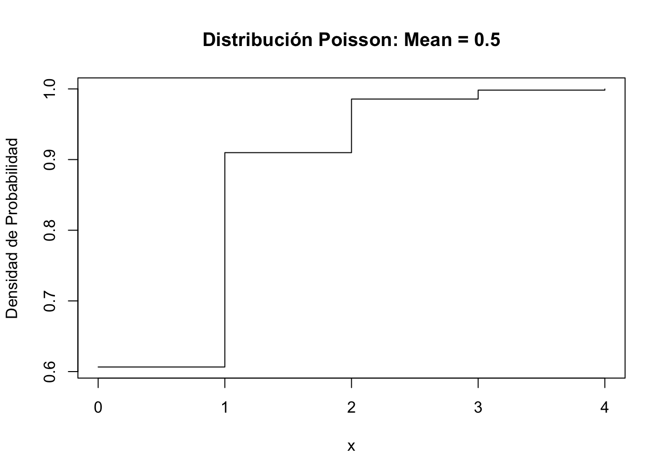plot(x[-1], ppois(x, lambda=0.5)[-length(x)], xlab="x", ylab="Densidad de Probabilidad",