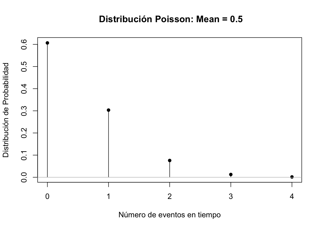 plot(x, dpois(x, lambda=0.5), xlab="Número de eventos en tiempo", ylab="Distribución de Probabilidad", main=" Distribución Poisson: Mean = 0.5", type="h")