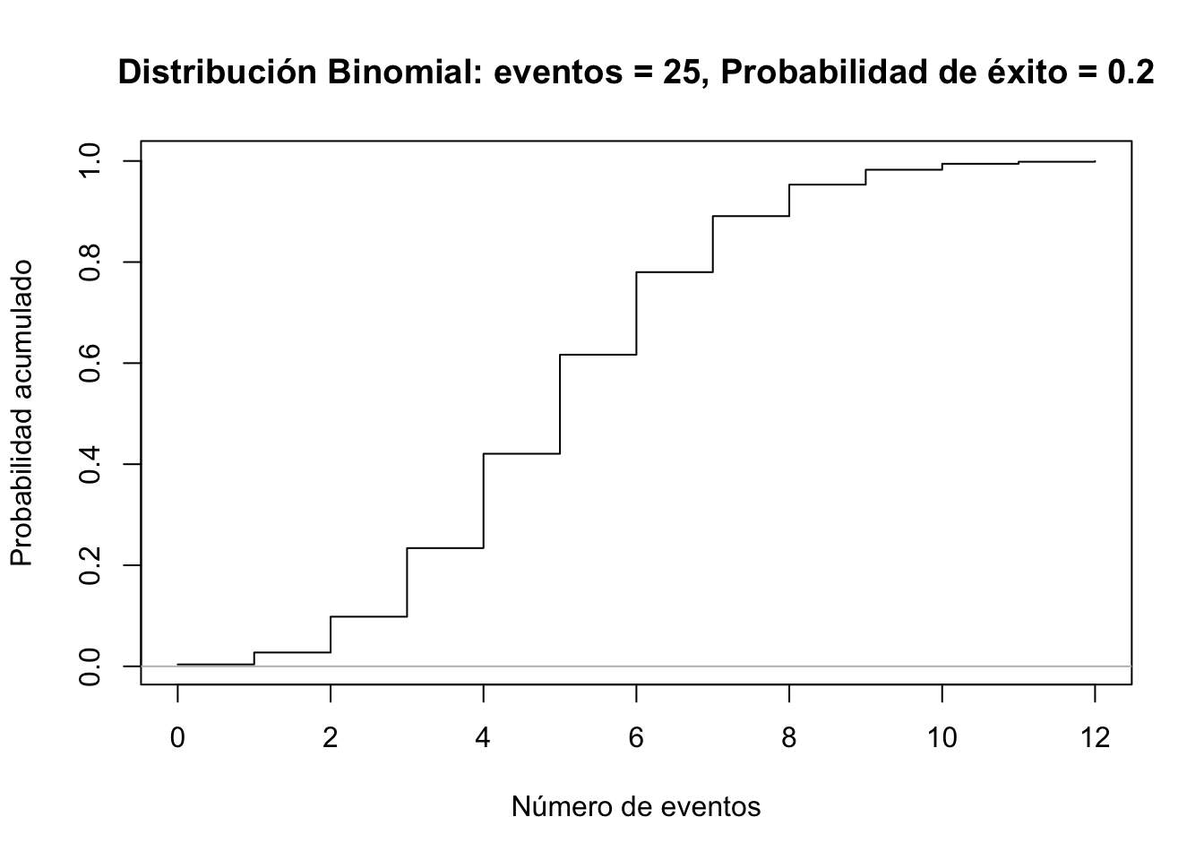 plot(x[-1], pbinom(x, size=25, prob=0.2)[-length(x)], xlab="Número de eventos", ylab="Probabilidad acumulado", main="Distribución Binomial: eventos = 25, Probabilidad de éxito = 0.2", type="l")