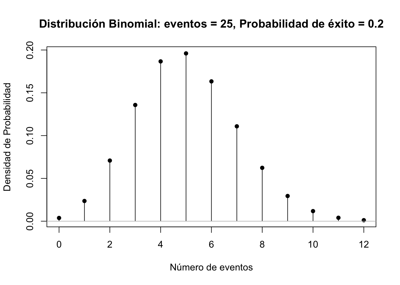 plot(x, dbinom(x, size=25, prob=0.2), xlab="Número de eventos", ylab="Densidad de Probabilidad", main="Distribución Binomial: eventos = 25, Probabilidad de éxito = 0.2", type="h")
