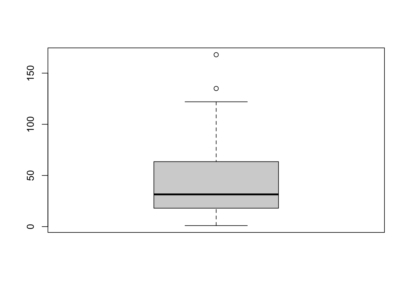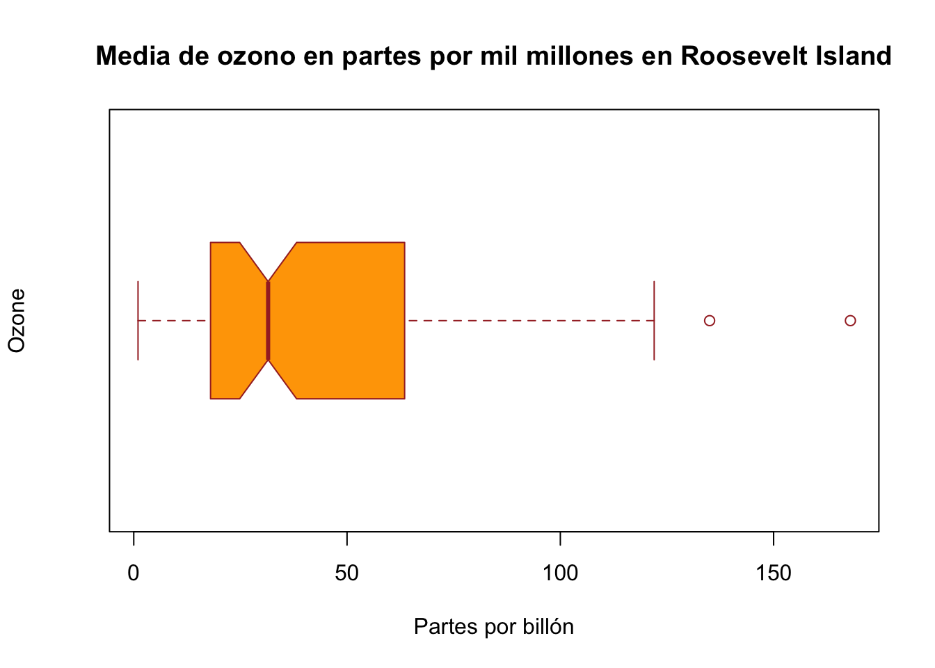 ?boxplotAlgunos de los que se utilizan con más frecuencia son,main para dar el título, xlab y ylab para proporcionar etiquetas para los ejes, col para definir el color, etc. Además, con el argumento horizontal = TRUE podemos trazarlo horizontalmente y con notch = TRUE podemos agregar una muesca al cuadro: