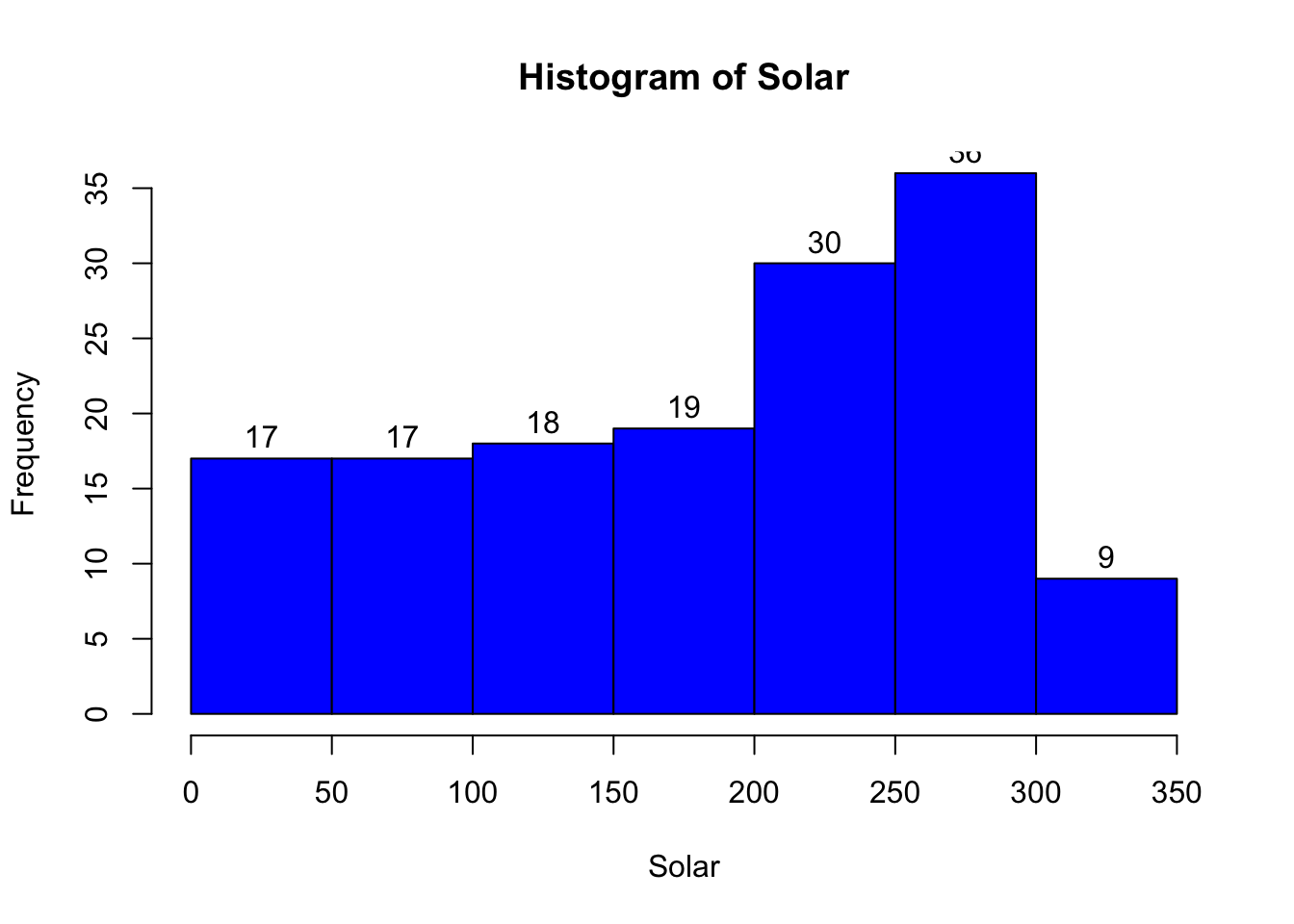 Con el mismo conjunto de datos airquality, pero con la variable: Solar.R: Radiación solar en Langleys en la banda de frecuencia 4000–7700 Angstroms de 0800 a 1200 horas en Central Park construya un histograma azul y que se muestre los valores sobre las barras. A la variable llamela Solar.