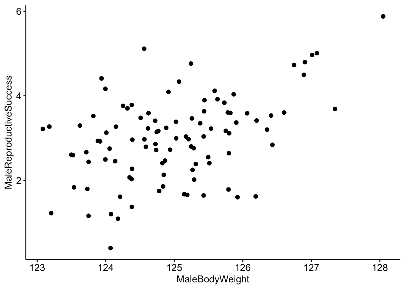 Now we can use R to create a linear model to quantitatively investigate the relationship between our two variables. Linear models describe the relationship of a continuous variable (in this case ‘MaleReproductiveSuccess’) as a function of predictor variable(s). In the linear model below we are interested in the relationship between MaleBodyWeight and MaleReproductiveSuccess.