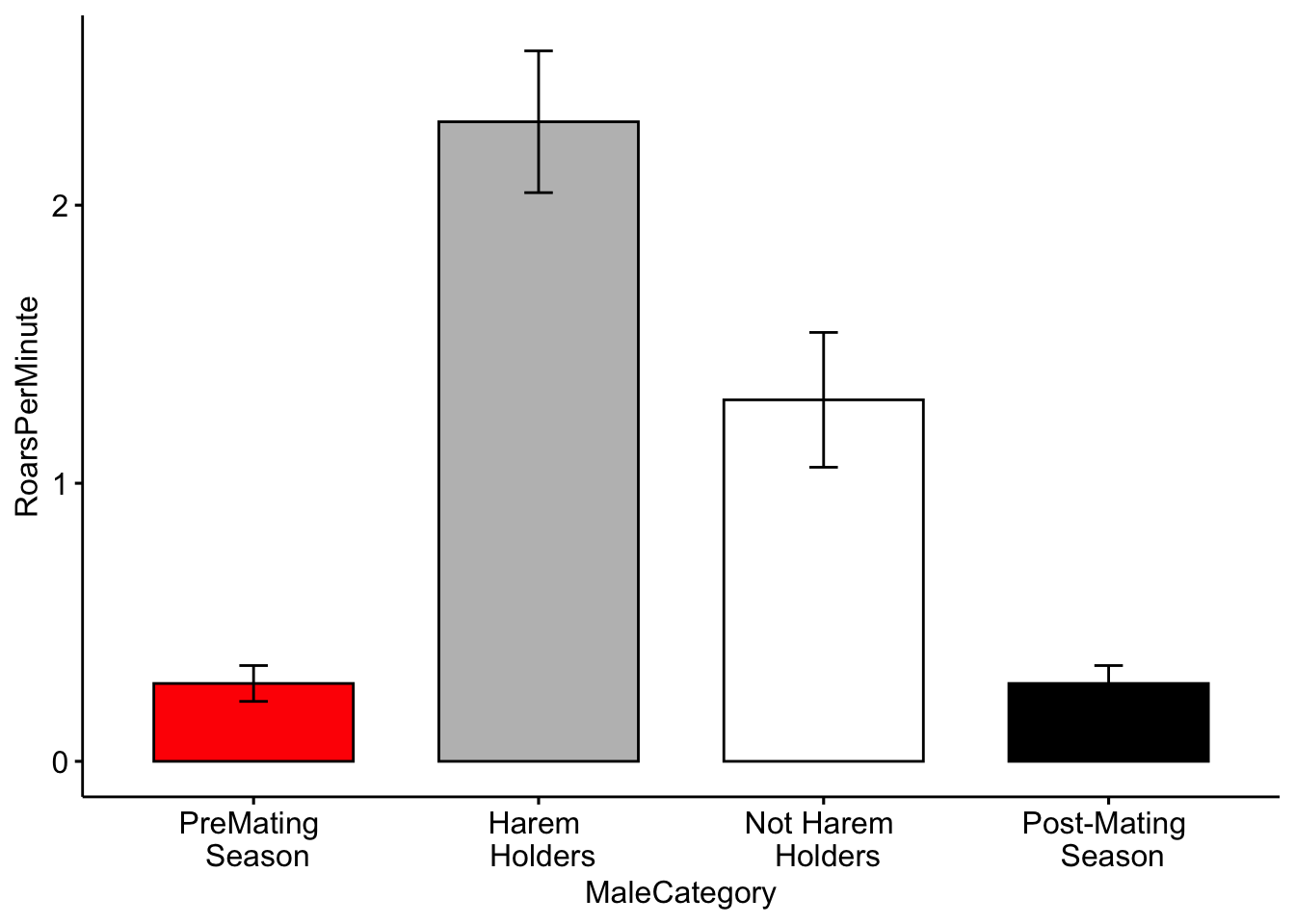 ggbarplot(MaleDeerRoarDF, x='MaleCategory', y='RoarsPerMinute', fill = 'MaleCategory',