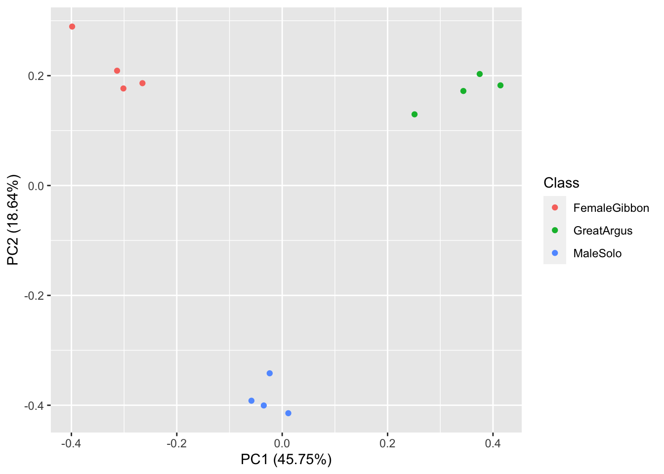 OK, now we are ready to do some plotting. If you remember from our earlier lab, the data structure we have here is multivariate, as each call has multiple values associated with it. So we will use the same approach (principal component analysis) to visualize our gibbon and great argus calls.