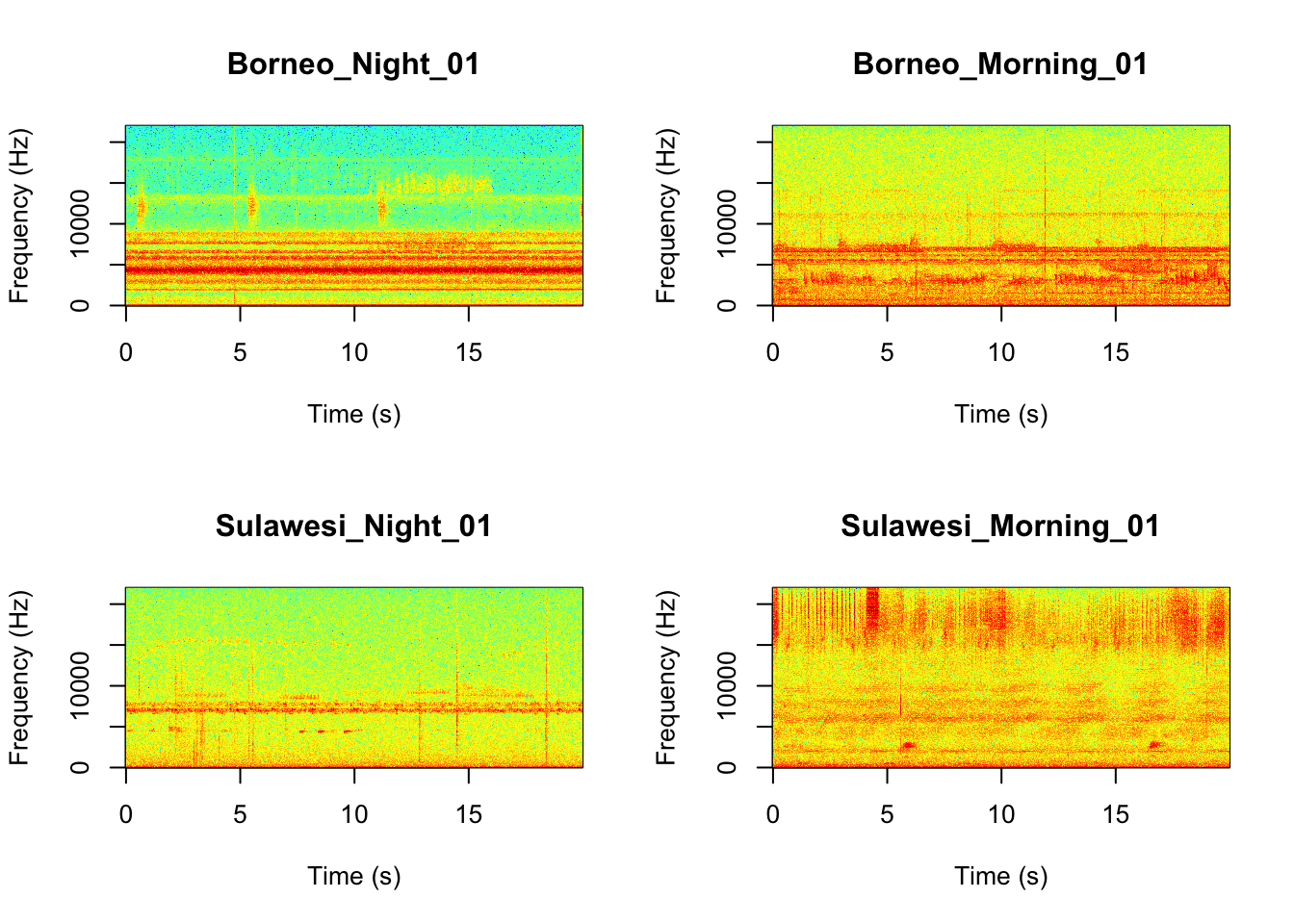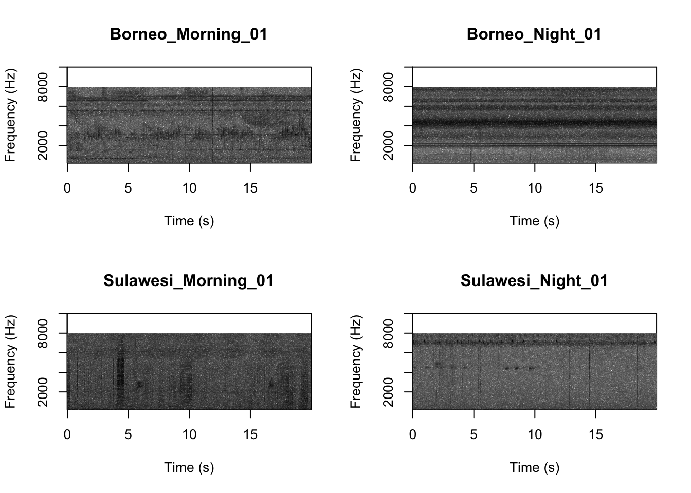 It looks like the Borneo_Night sampling period was much different from the rest! Let’s look at a single spectrogram from each sampling location and time.
