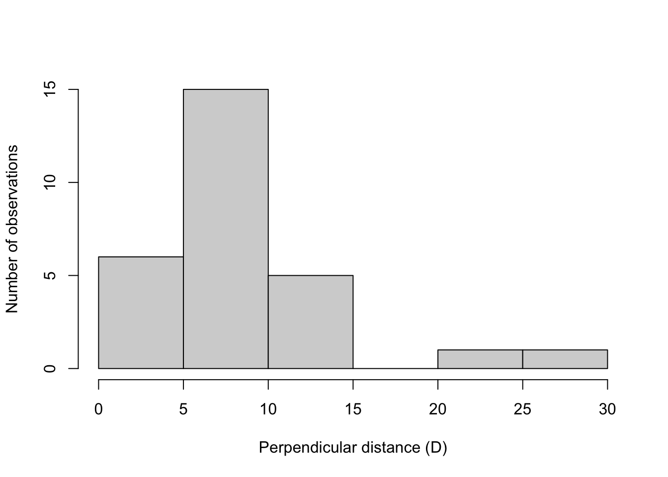 In this example there is a clear break between 15 and 20 meters, so we will only use observations that were within 15 meters.