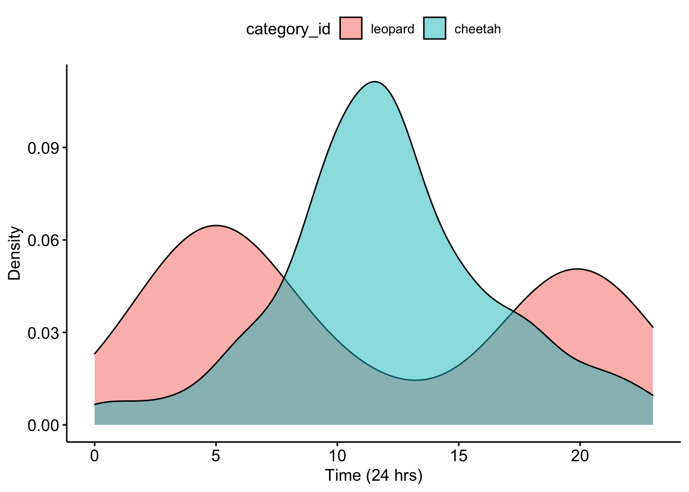 Now we can make a density plot that will show the distribution of camera trap photos that were taken over 24-hours. We add the fill = ‘category_id’ so that we show different distributions for each animal.