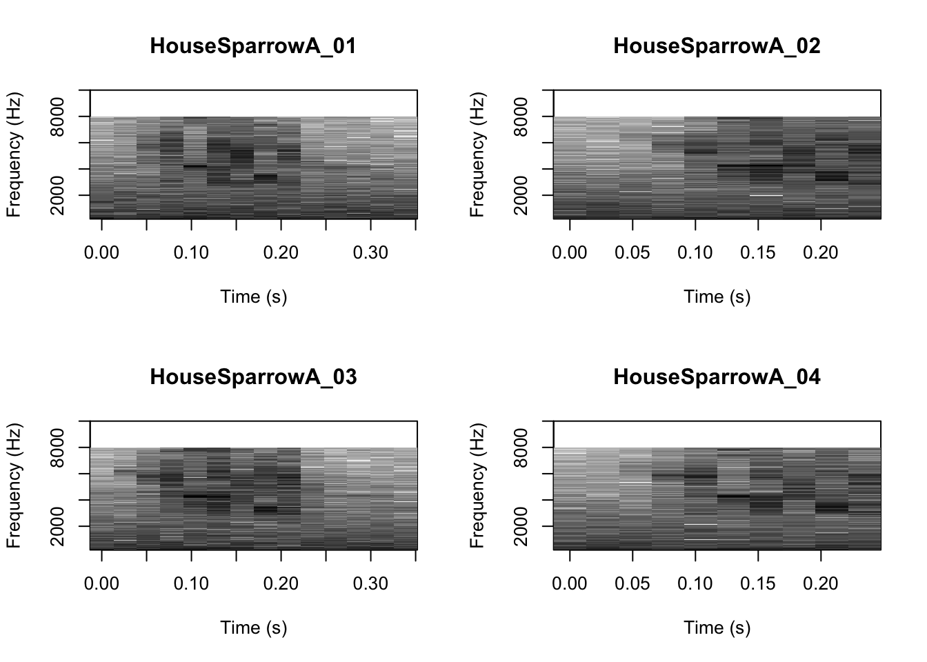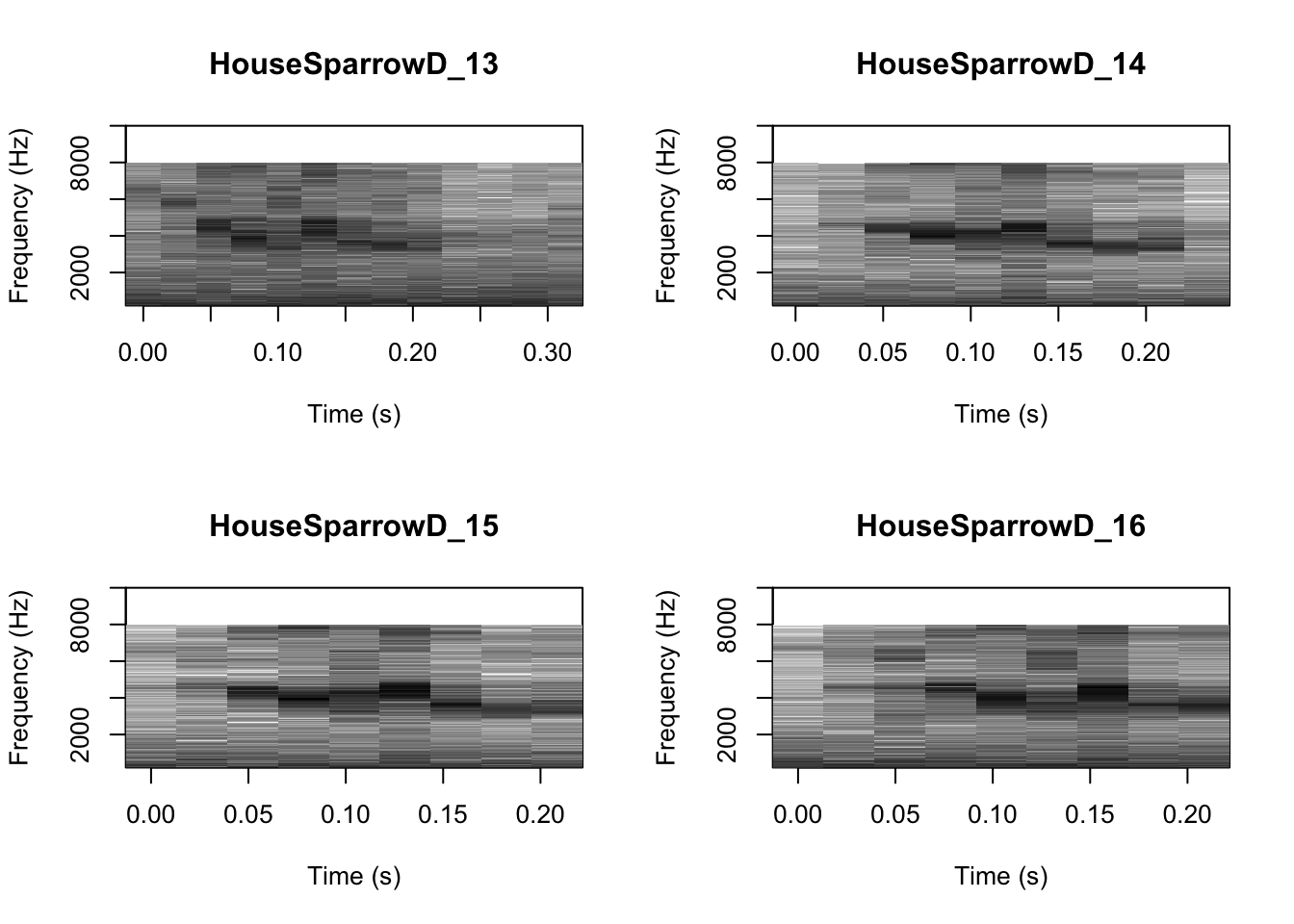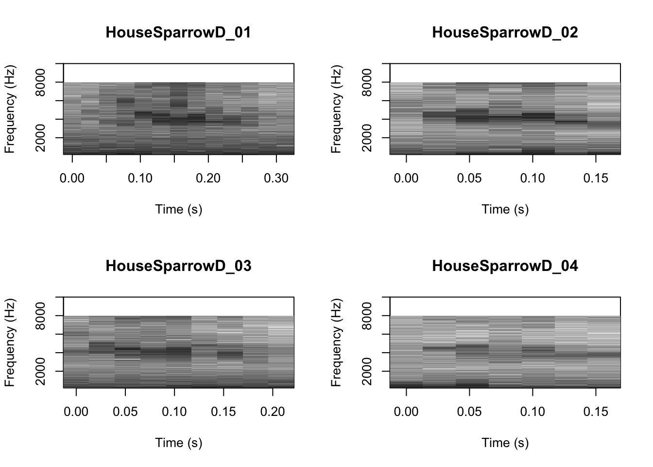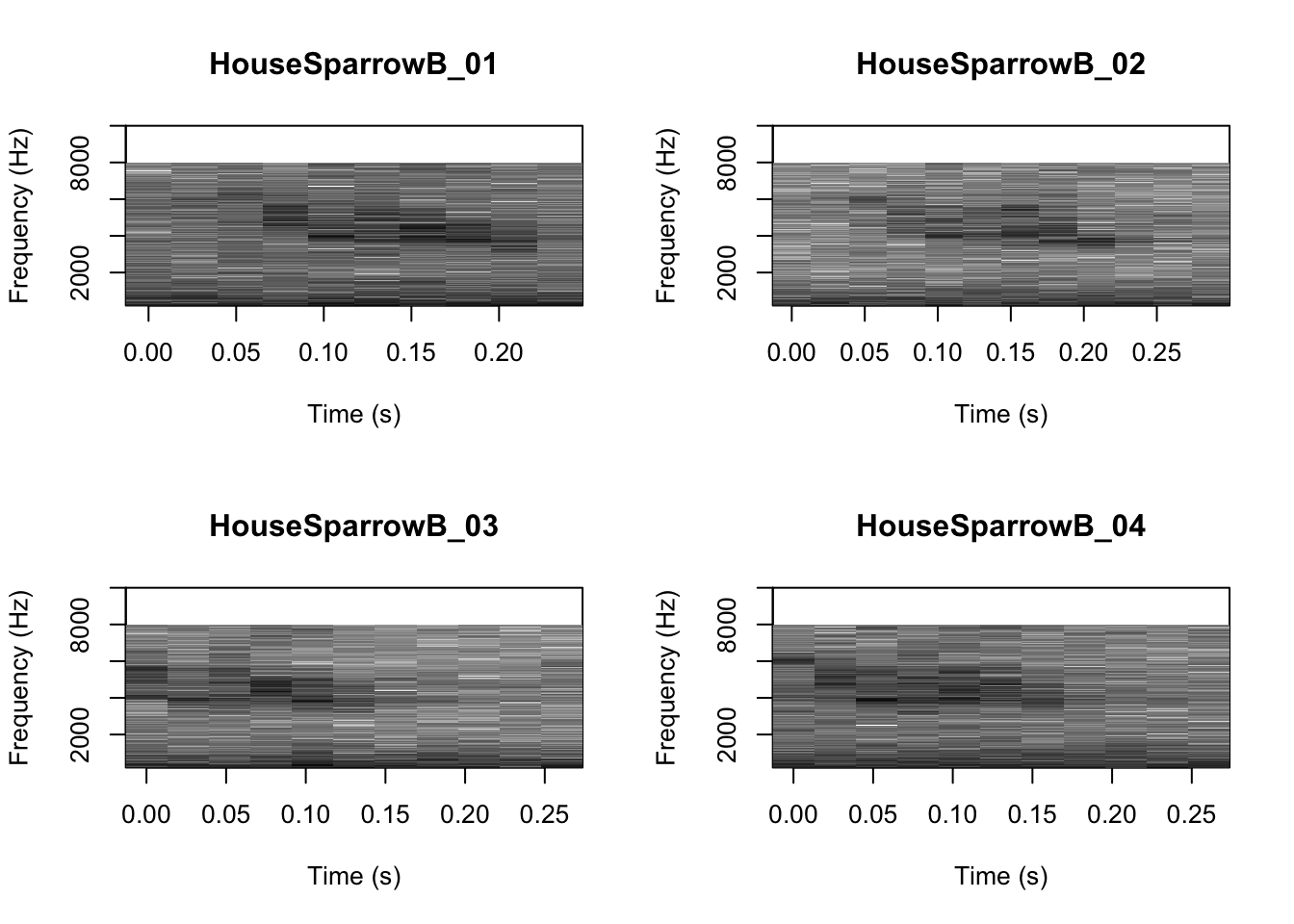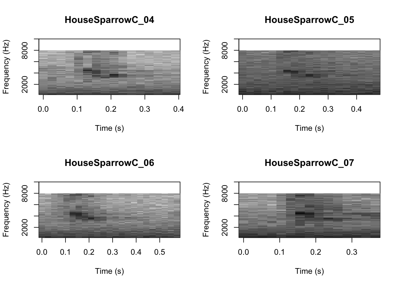 # We can tell R to print the spectrograms 2x2 using the code below