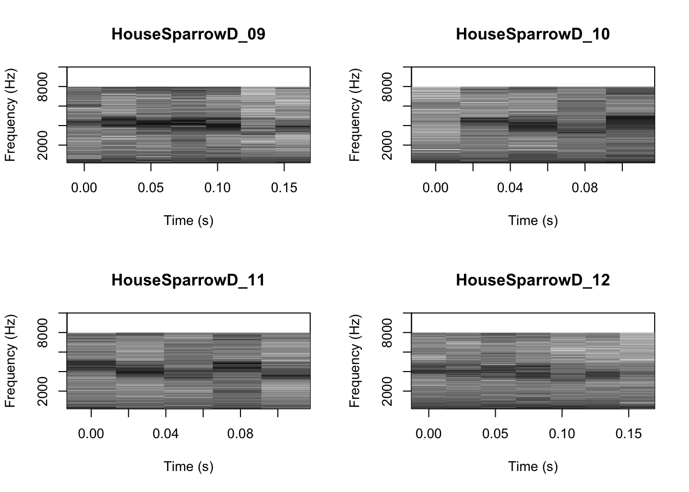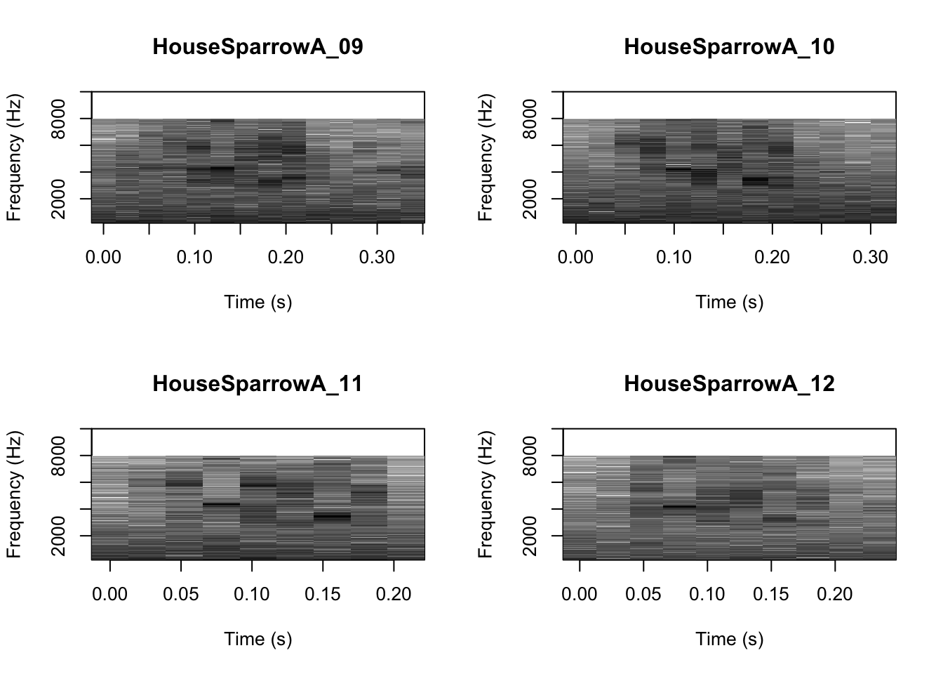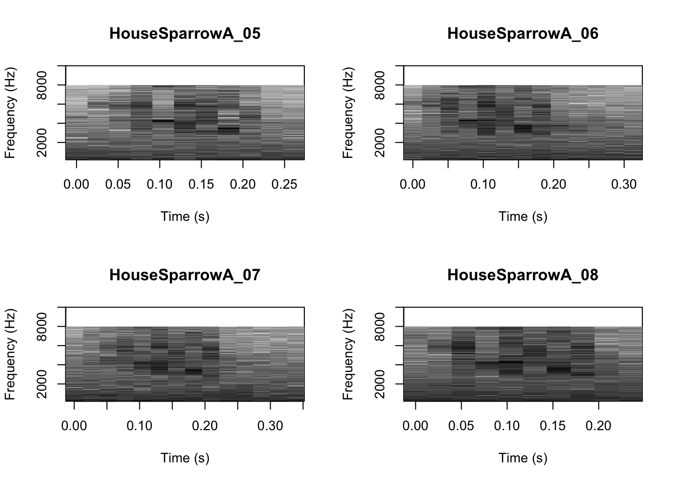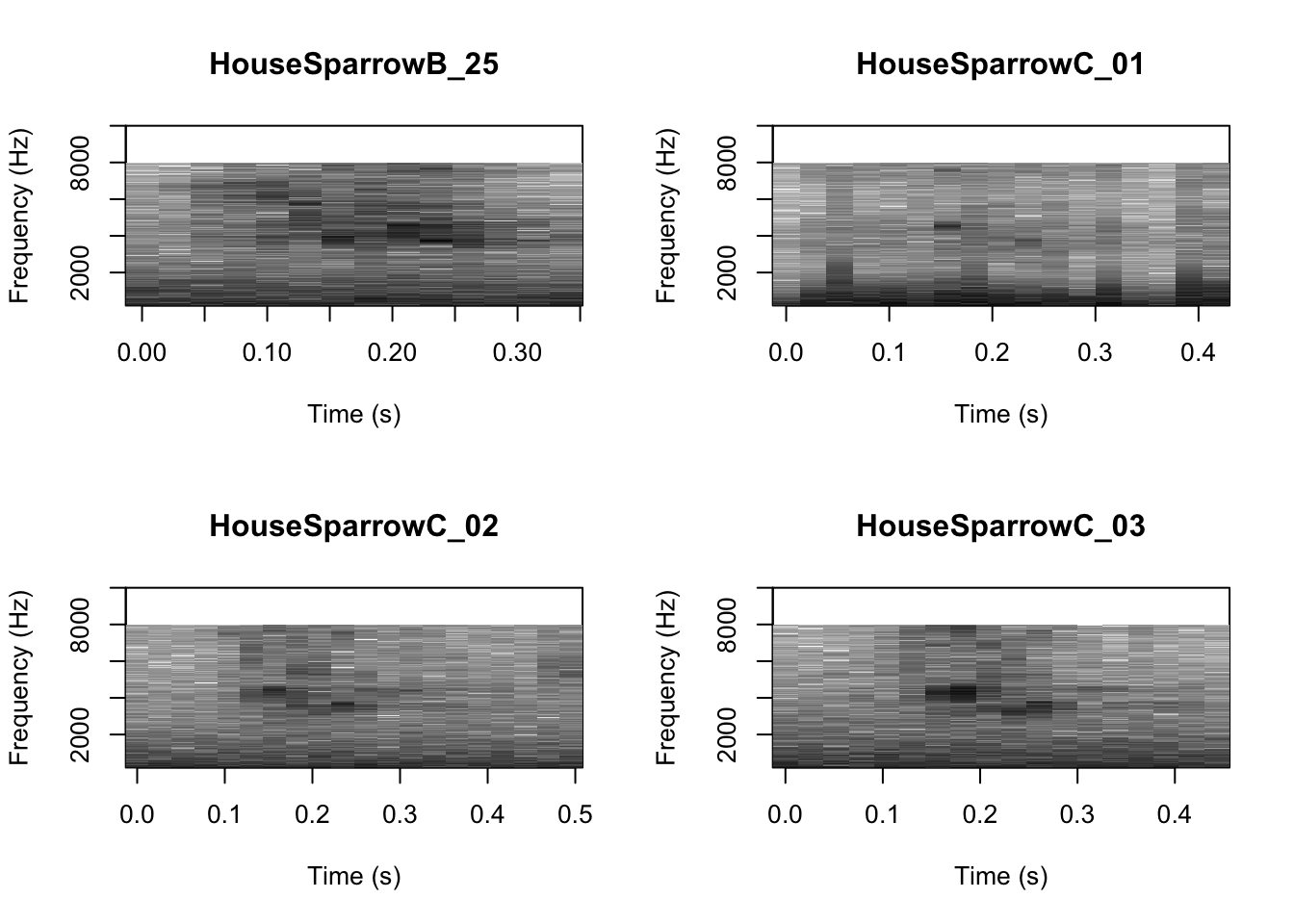 # We can tell R to print the spectrograms 2x2 using the code below