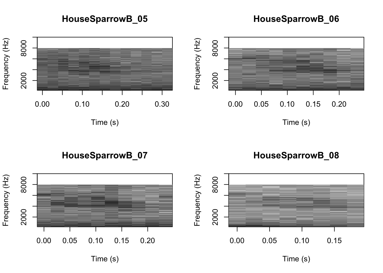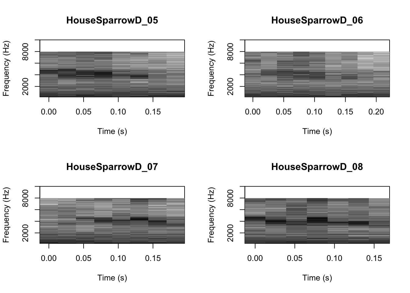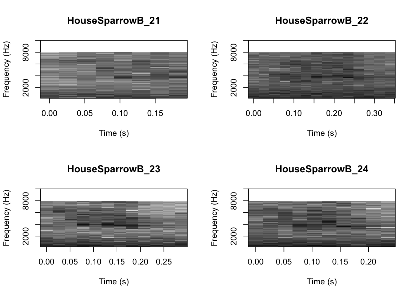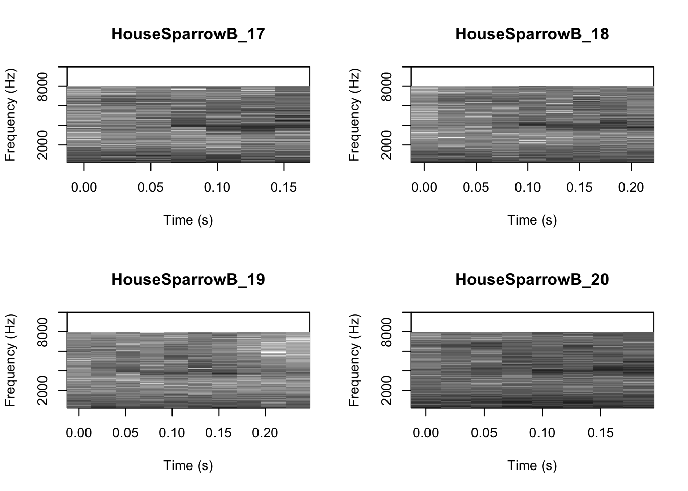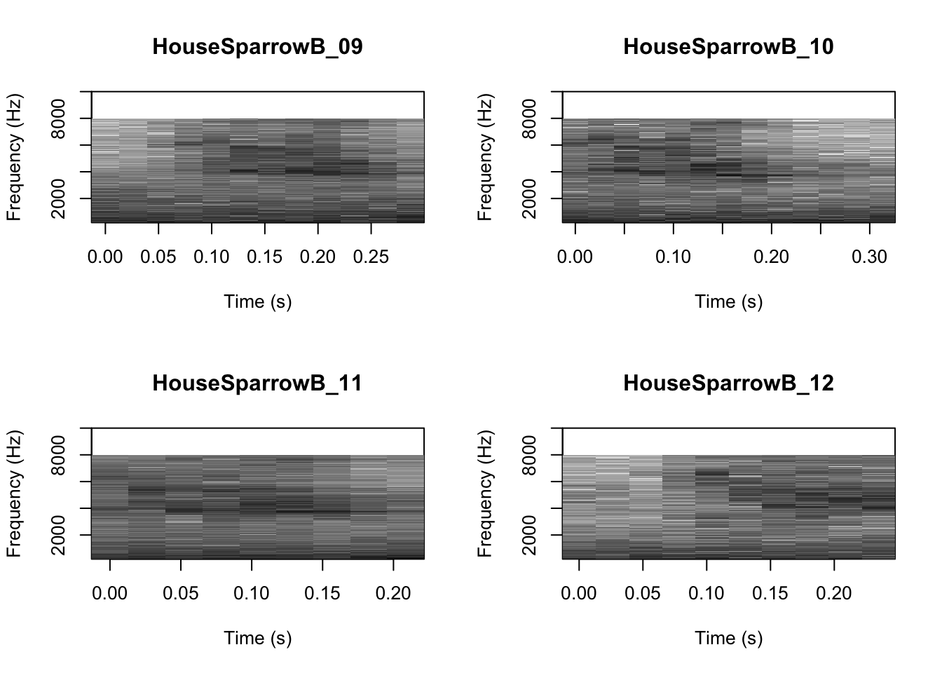 # We can tell R to print the spectrograms 2x2 using the code below