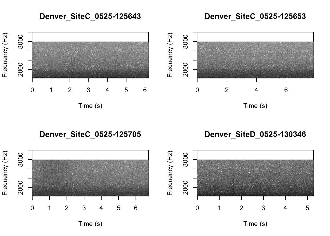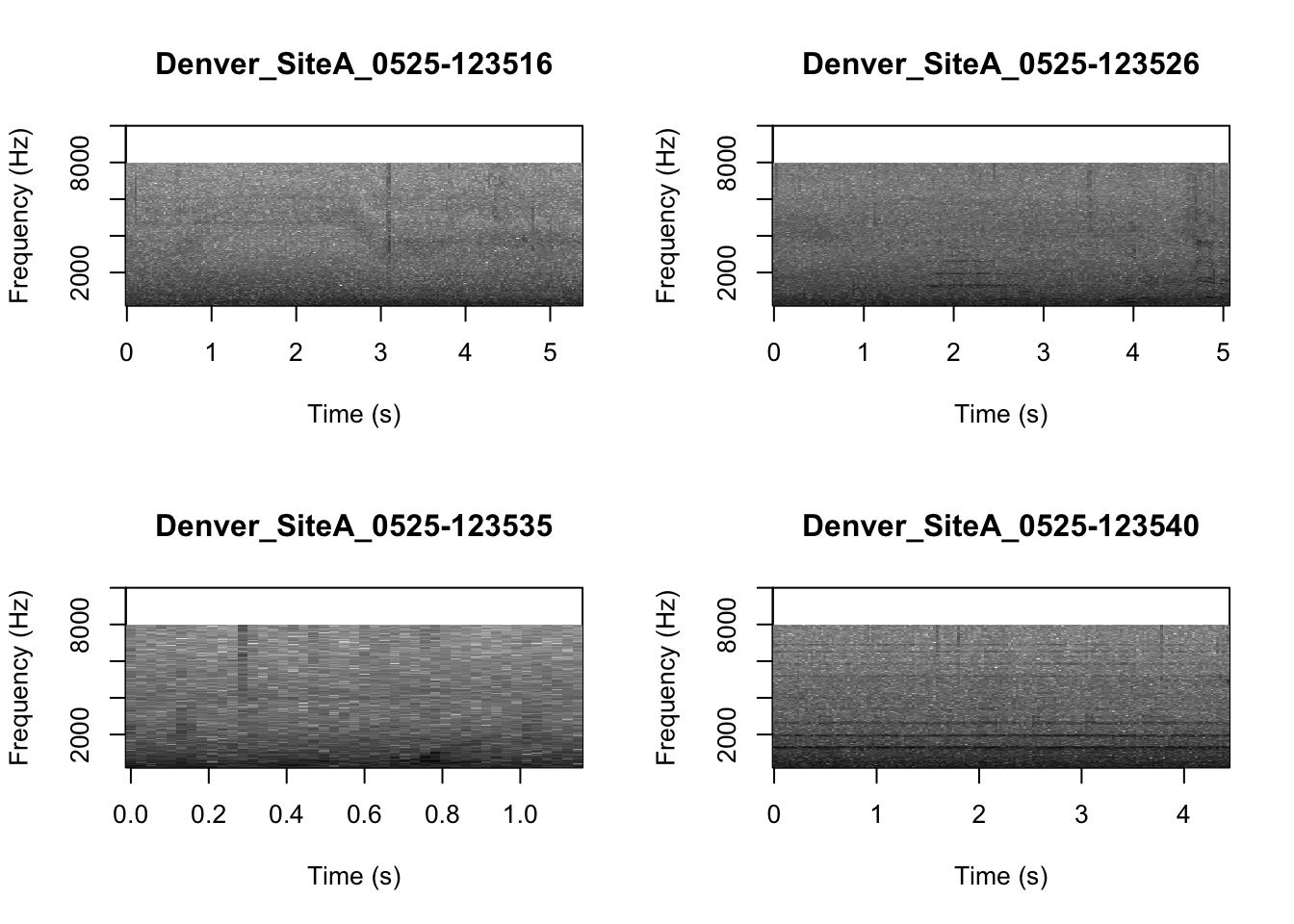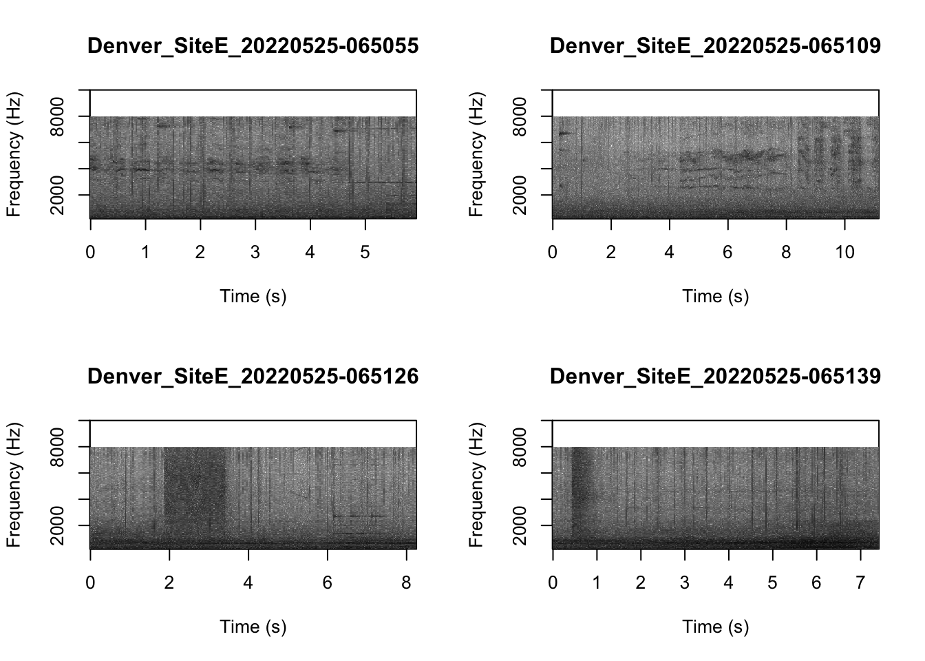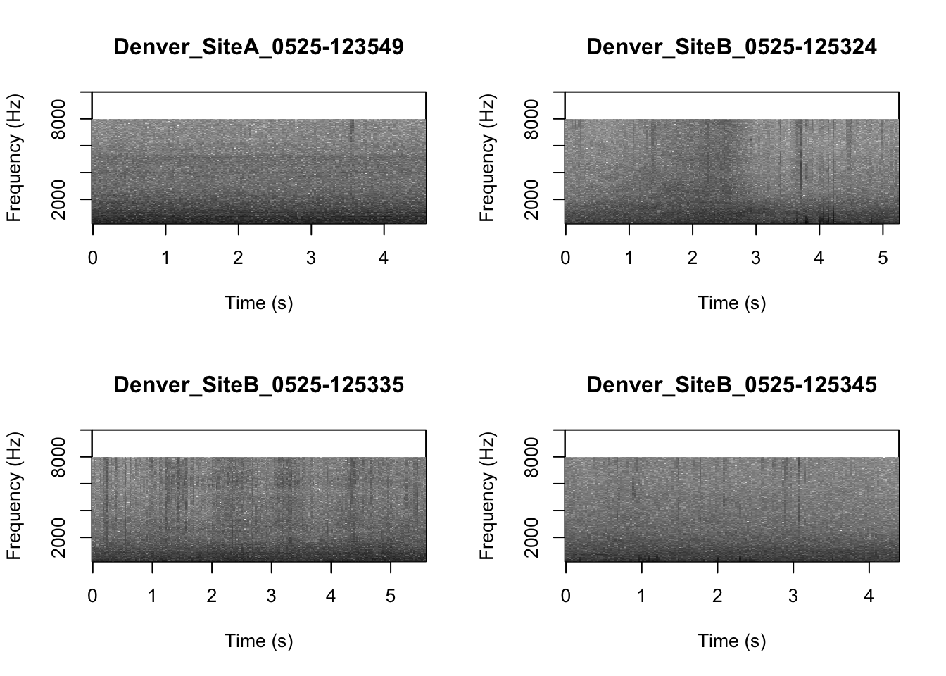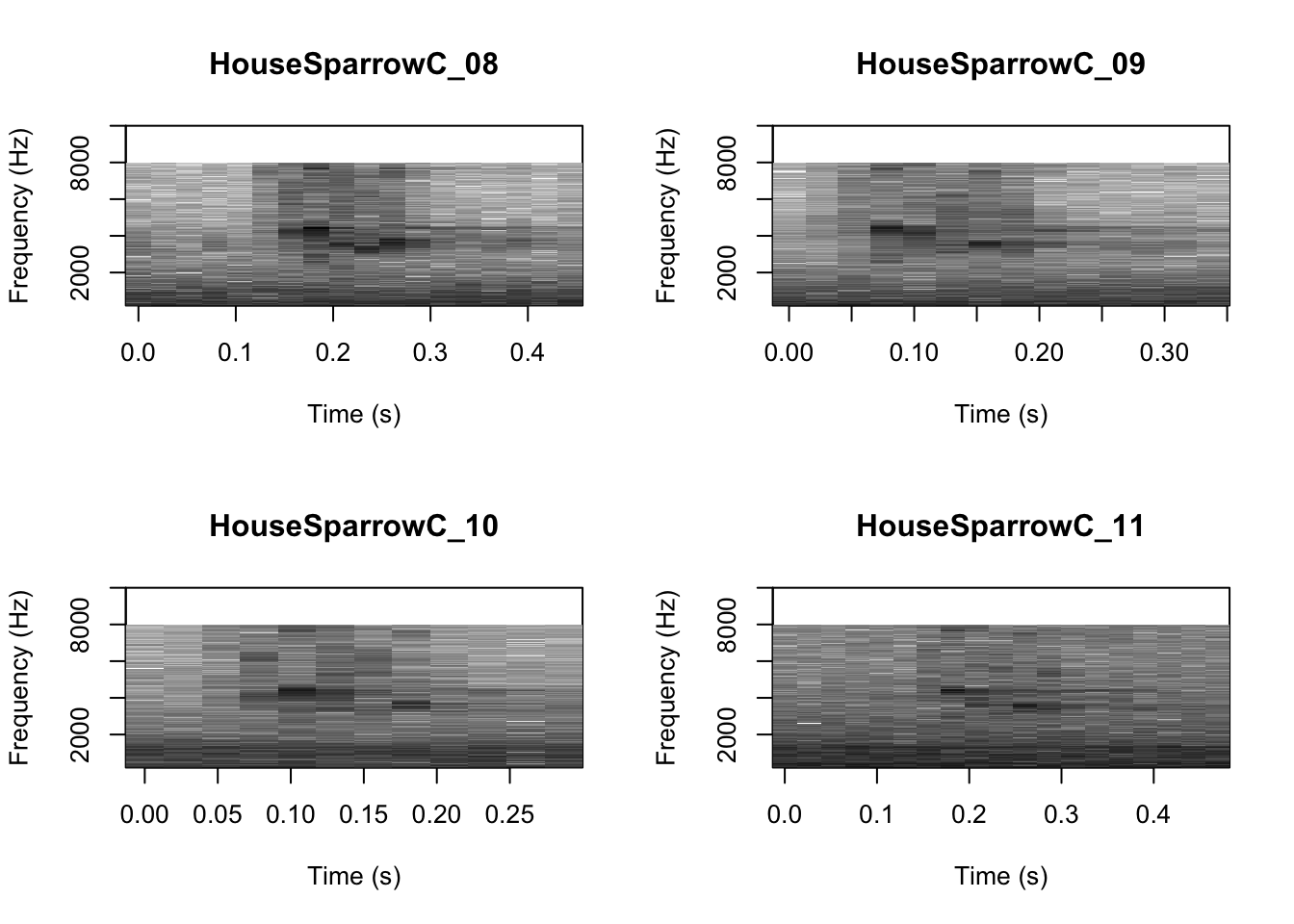 # We can tell R to print the spectrograms 2x2 using the code below