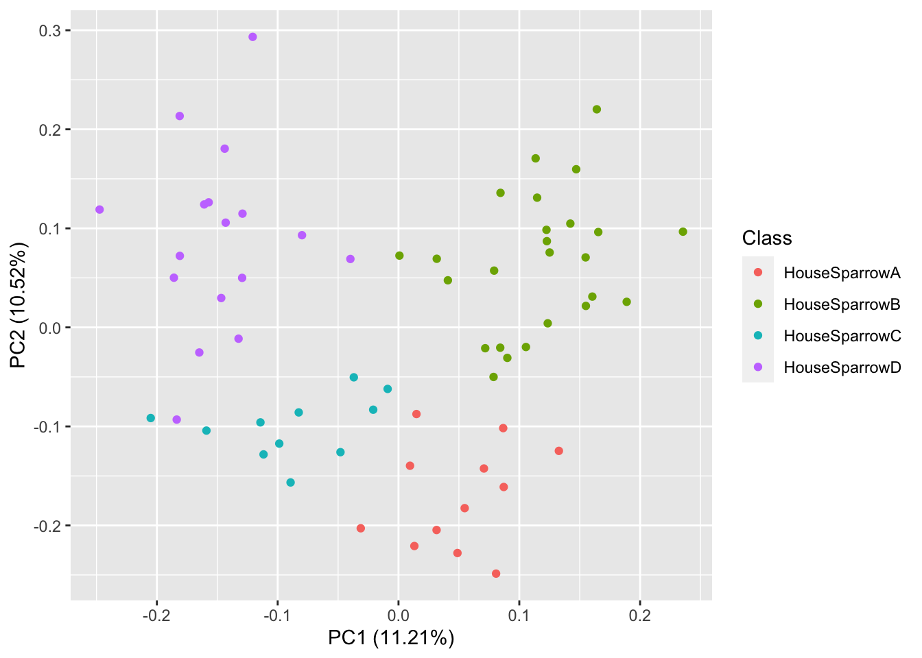 MyFeatureDataFrame <- MFCCFunction(input.dir = "MyFocalRecordings",min.freq = 3000,max.freq=7000)Then we run the principal component analysis