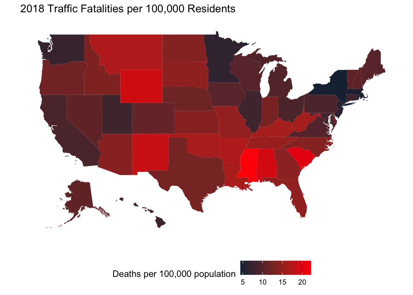 They have data for the 2018 traffic fatality death rates by state which can be used to produce the following chloropleth (geographic map colored by rate)