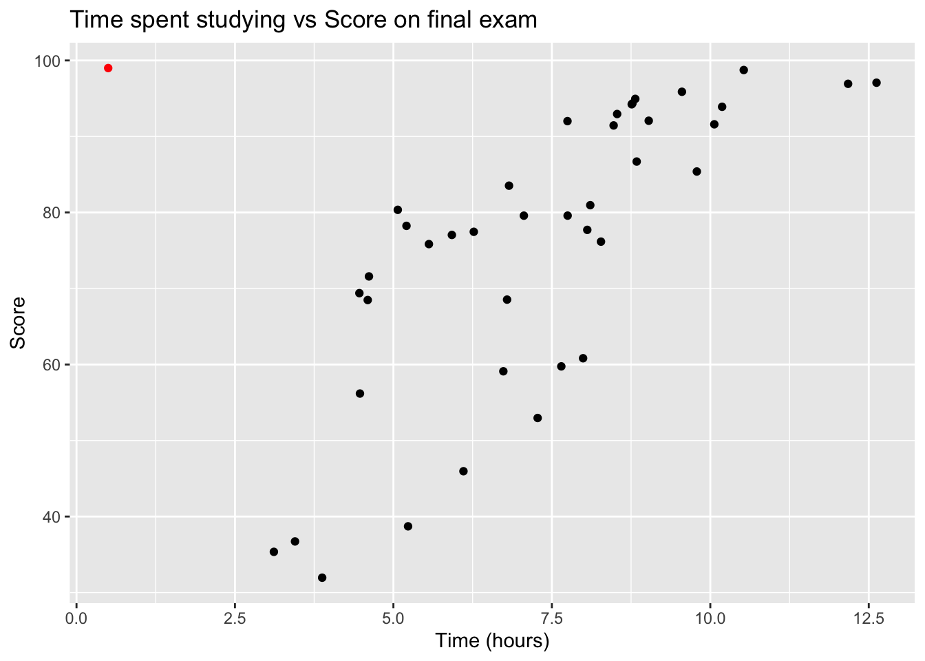However, there is one student that is extremely unusual (highlighted in red). This student had actually taken some upper division courses but realized she needed to take the introductory course in order to graduate. Nobody would reasonably claim that this student’s performance reasonably invalidates the trend. There are always data points that are unusual and might even be counter to the general trend.