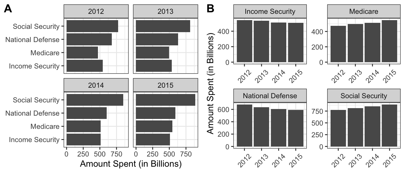 In the following figure, we’ve graphed the amount spent by the US government on four different programs over four years (2012-2015).