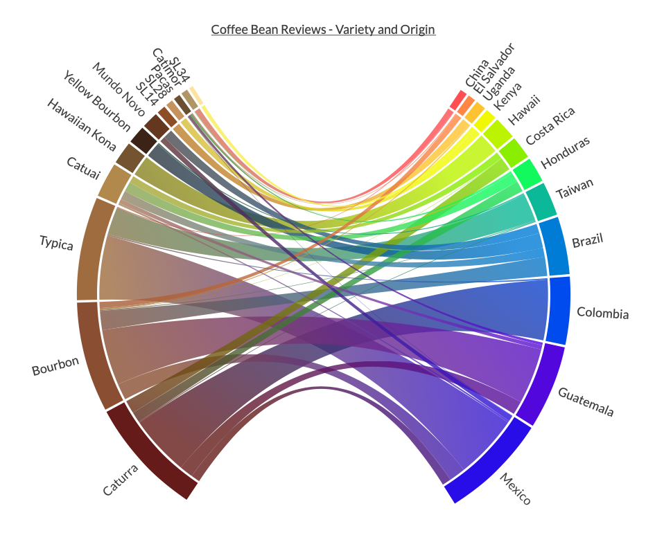 In this example, we have information about the country of origin and coffee types. This is an interactive graph and reader can select a country or variety and see the corresponding item.