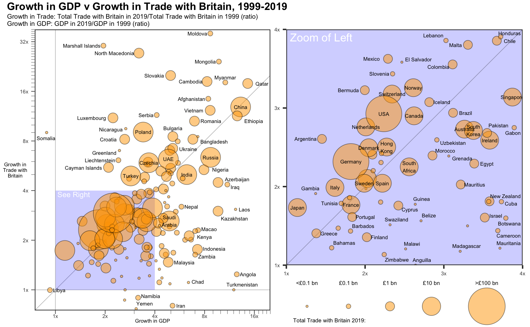 In this scatter plot example, the x and y-axes are a country’s GDP growth versus the its growth in trade with Britain. So data points above the 1-to-1 line have increased their economic ties with Britain and points below have reduced their ties.