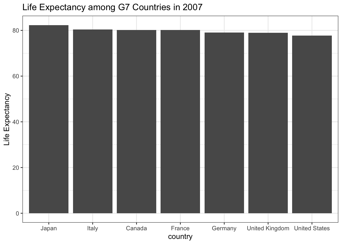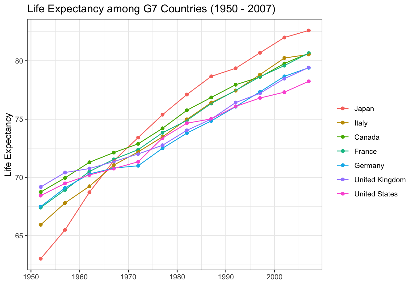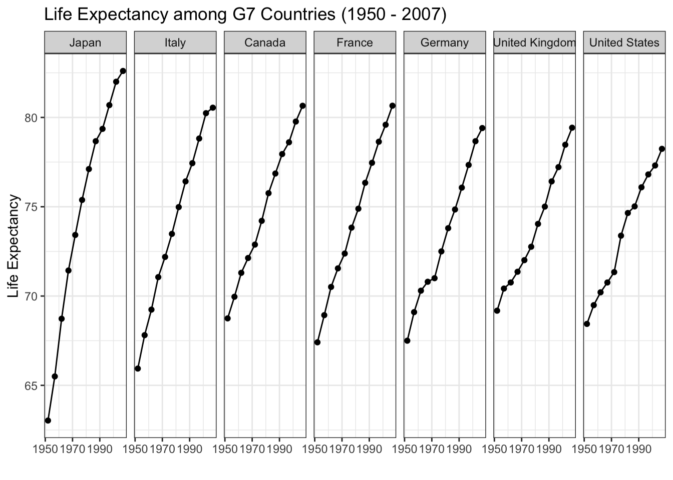 We could have also used color to indicate which country is which, but this produces a bit of a spaghetti plot and is difficult to interpret. However, it is easier to identify when Japan’s life expectancy surpassed the rest of the G7 countries.