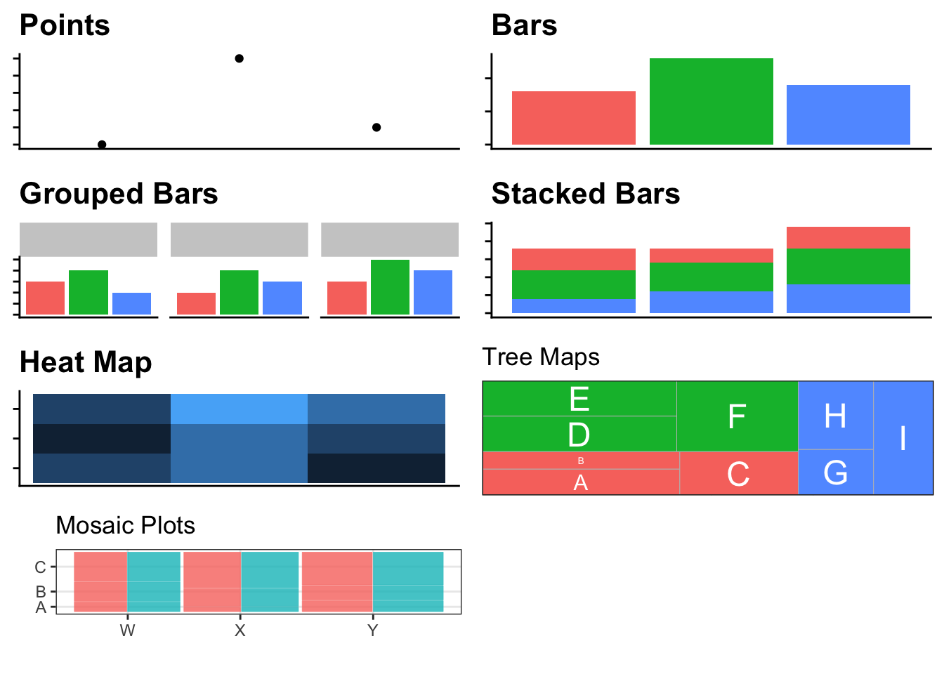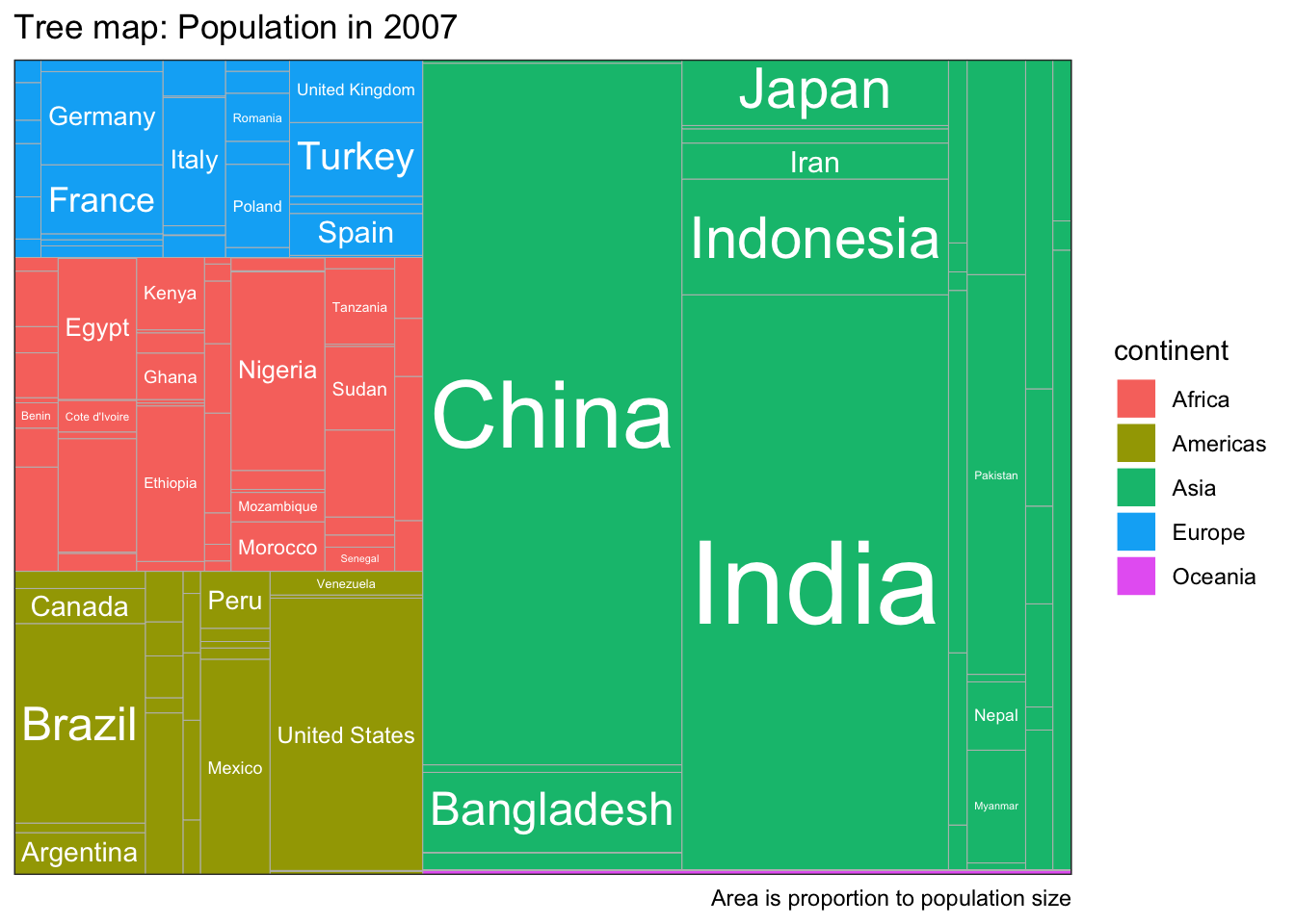 This differs from a mosaic plot in that a country only occurs withing one continent whereas in a mosaic plot, a category level will occur in multiple “containers.”
