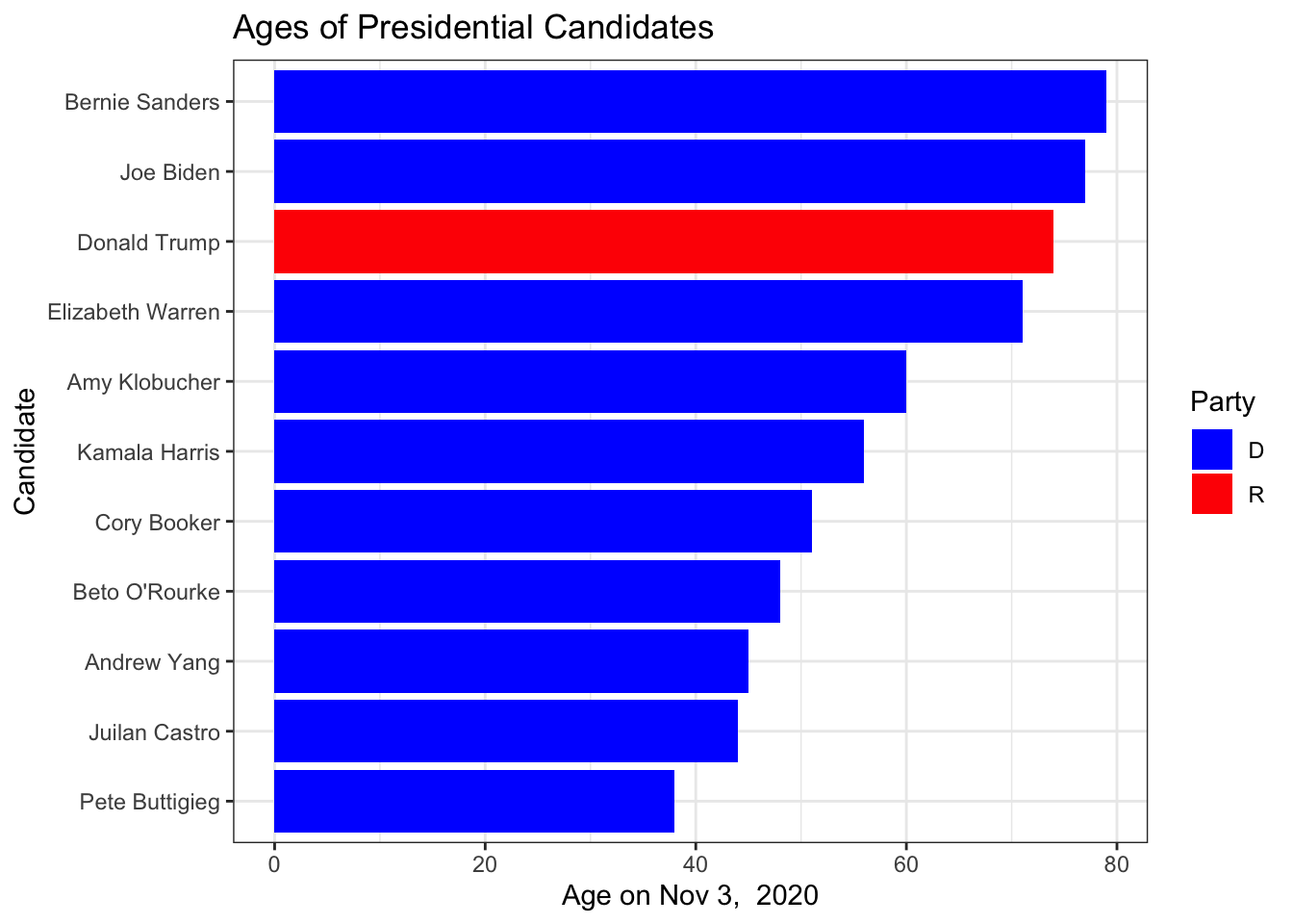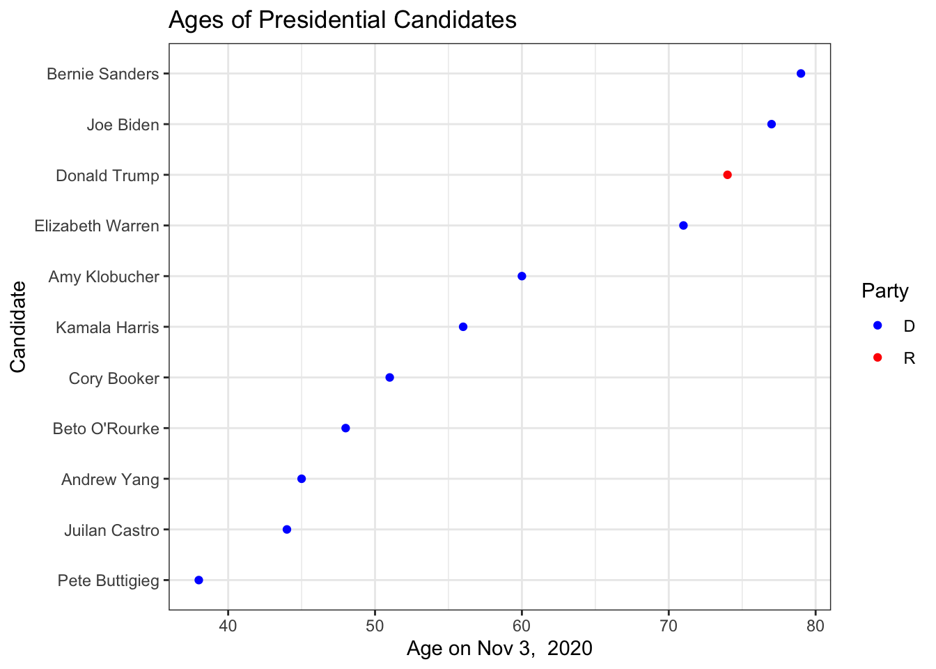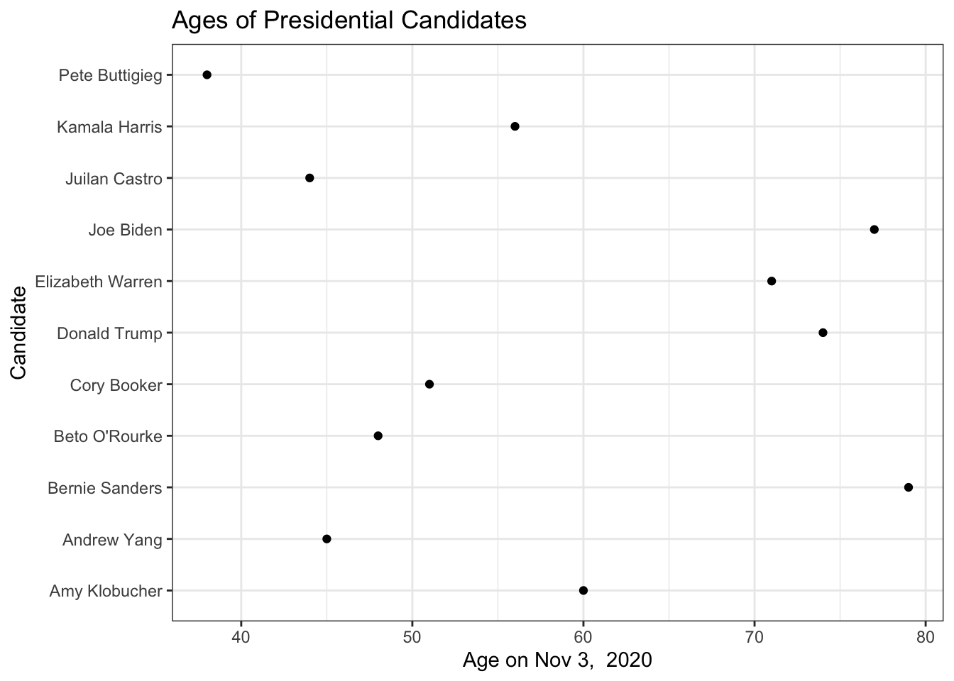 The 2020 presidential candidate field has a wide range of ages. The New York Times has a nice article showing the candidate ages. I grabbed a few of the most prominent candidates and pulled their birthdays from Wikipedia and then calculated their age on election day. As usual the data is available on the Github pages for this book.