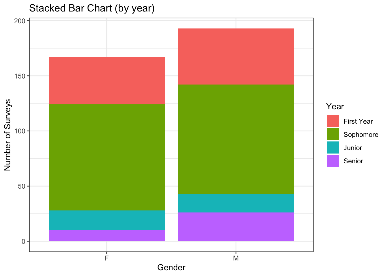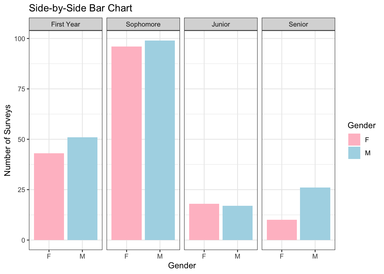 The first thing I notice is that there is approximate gender equality, but there are a few more males in class. It is only really possible to compare the genders among the Seniors because they start at the same point (common axis) but the other years don’t start at the same point (uncommon axis).
