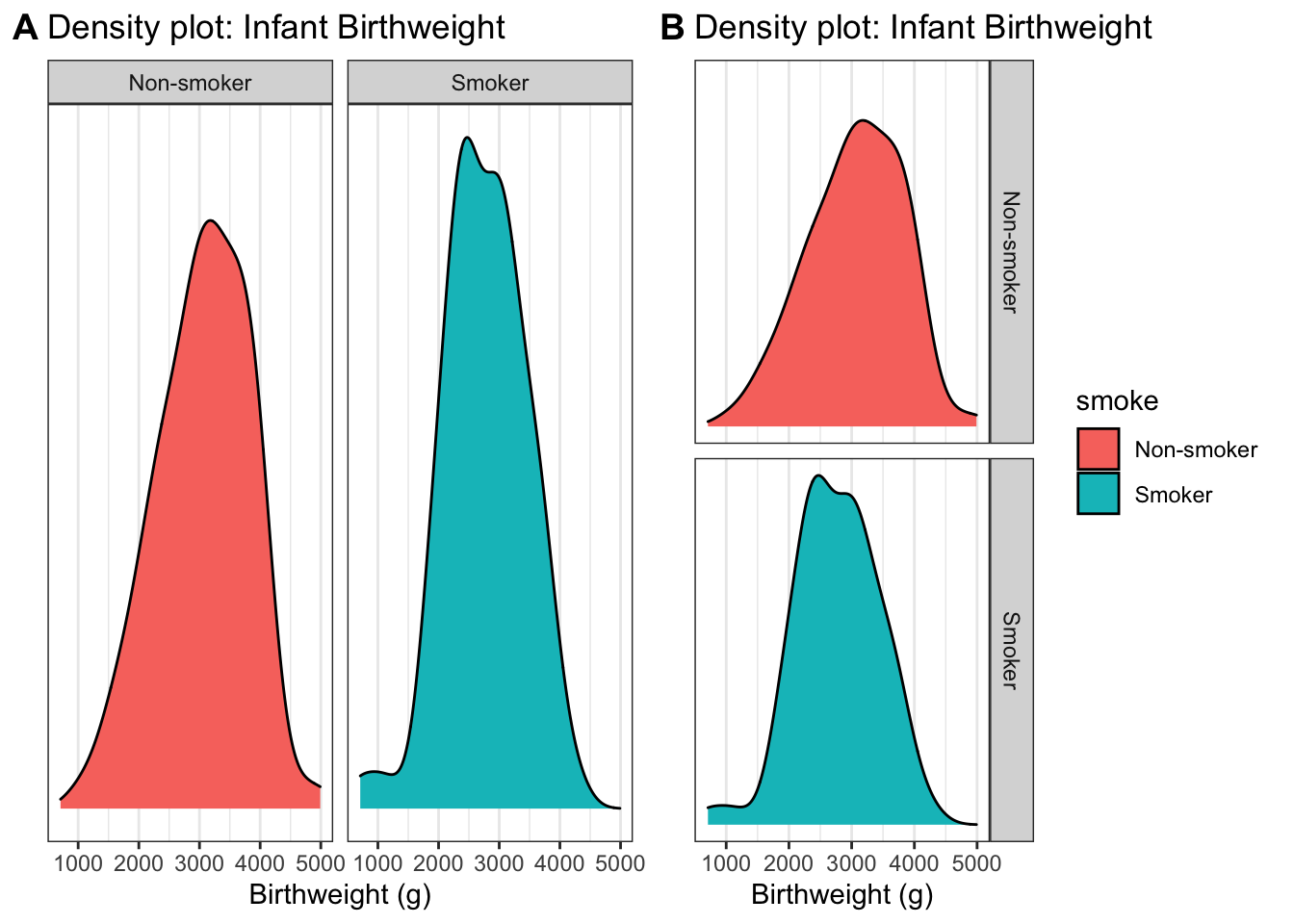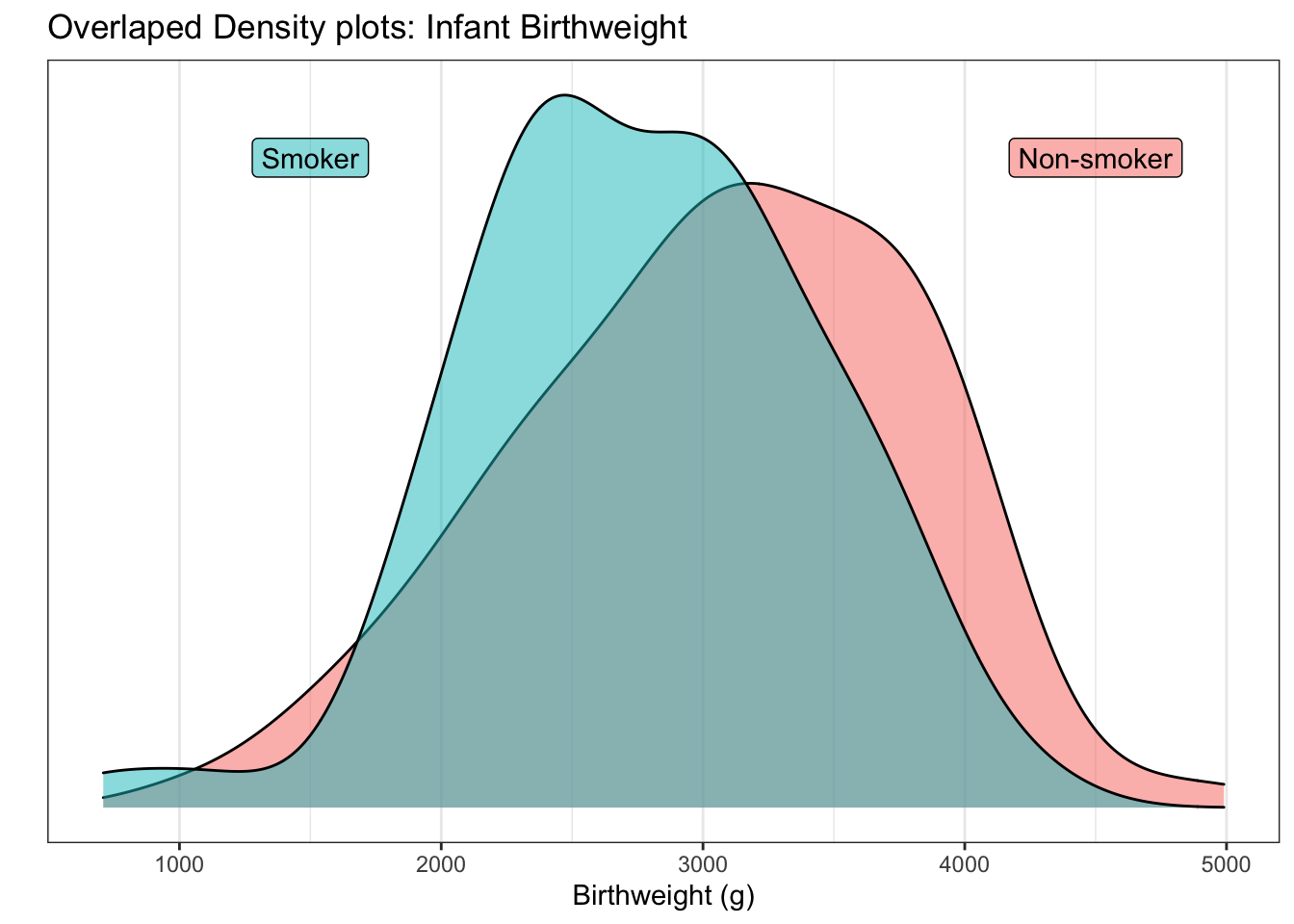 By choosing to put the two graphs on top of the other, it becomes clear that the smoker’s tend to give birth to smaller infants. This fact isn’t clear in the side-by-side graphs.