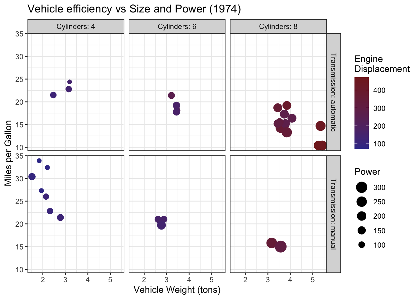 Start with the strongest relationship with those variables on the x and y axis. Preferentially, I’ll use quantitative variables for these. Next add other variables to the graph as attributes high on the EPT scale (size, color) or on the grouping scale (panels, shape). The critical aspect is that I want to select the most important relationship to be displayed via the x and y axis and then other relationships added on top via the other graph attributes.