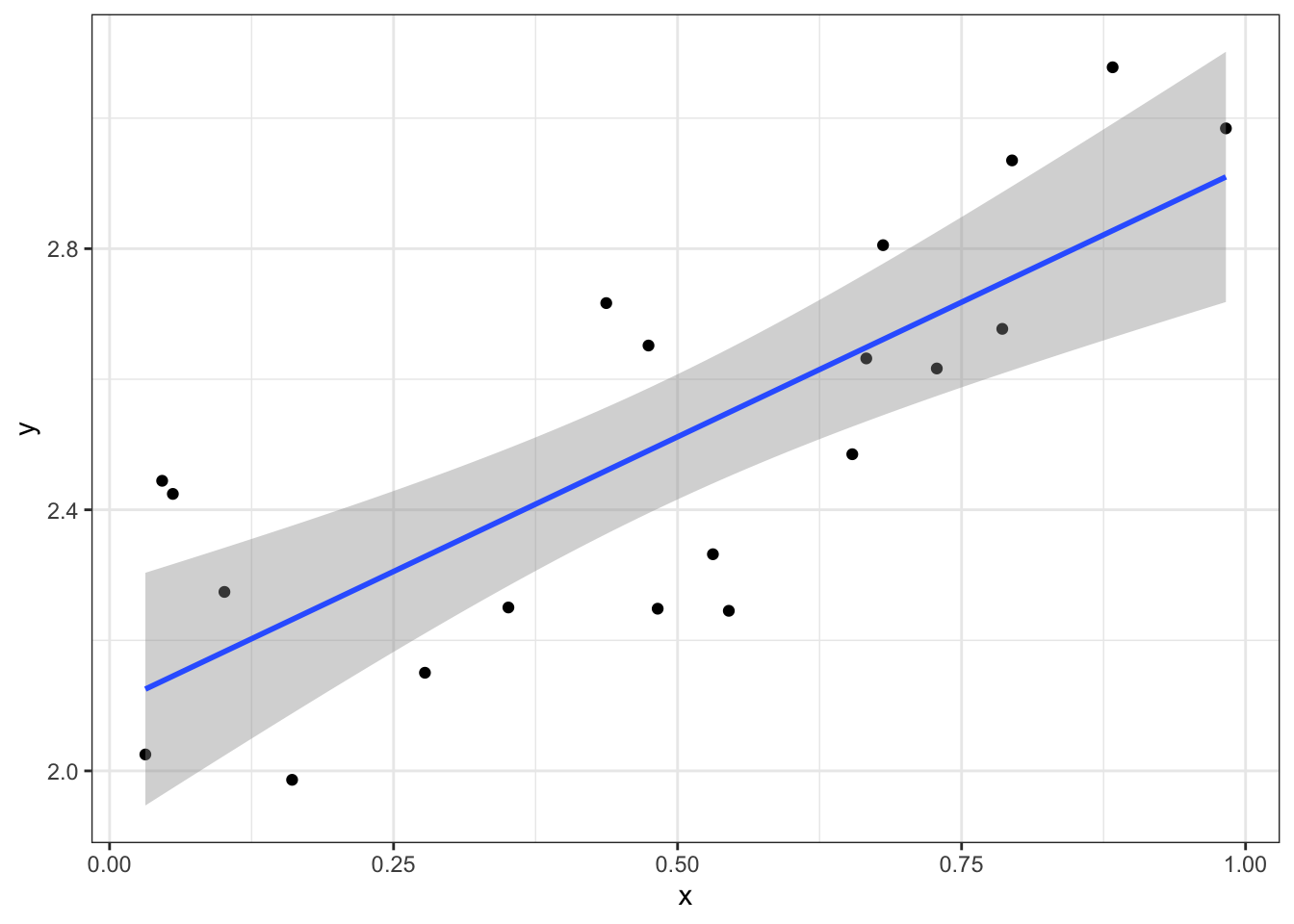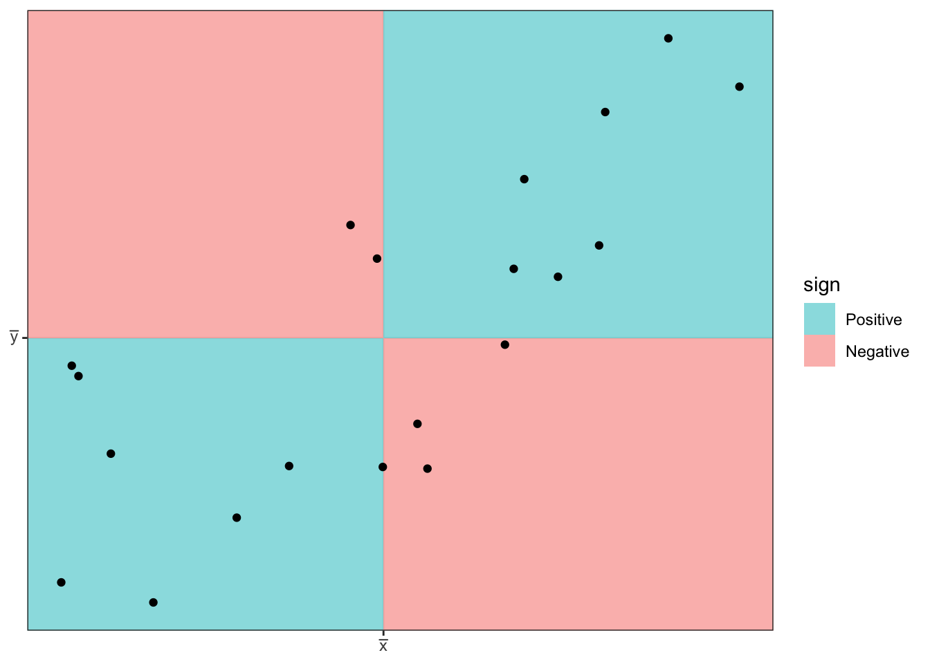 We first consider Pearson’s correlation coefficient, which is a statistics that measures the strength of the linear relationship between the predictor and response. Consider the following Pearson’s correlation statistic \[r=\frac{\sum_{i=1}^{n}\left(\frac{x_{i}-\bar{x}}{s_{x}}\right)\left(\frac{y_{i}-\bar{y}}{s_{y}}\right)}{n-1}\] where \(x_{i}\) and \(y_{i}\) are the x and y coordinate of the \(i\)th observation. Notice that each parenthesis value is the standardized value of each observation. If the x-value is big (greater than \(\bar{x}\)) and the y-value is large (greater than \(\bar{y}\)), then after multiplication, the result is positive. Likewise if the x-value is small and the y-value is small, both standardized values are negative and therefore after multiplication the result is positive. If a large x-value is paired with a small y-value, then the first value is positive, but the second is negative and so the multiplication result is negative.