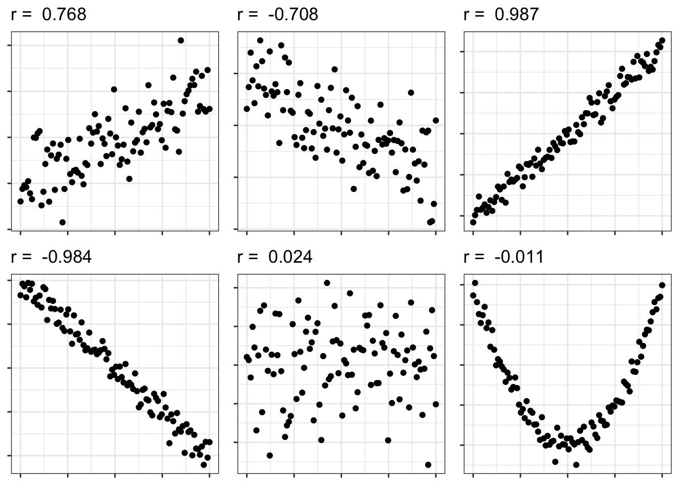 - A negative \(r\) denotes a negative relationship between \(x\) and \(y\), while a positive value of \(r\) represents a positive relationship.