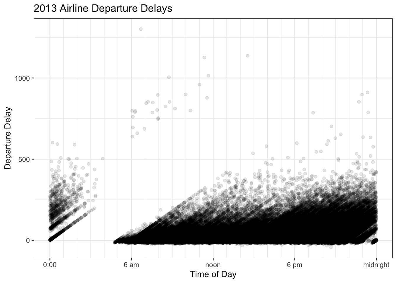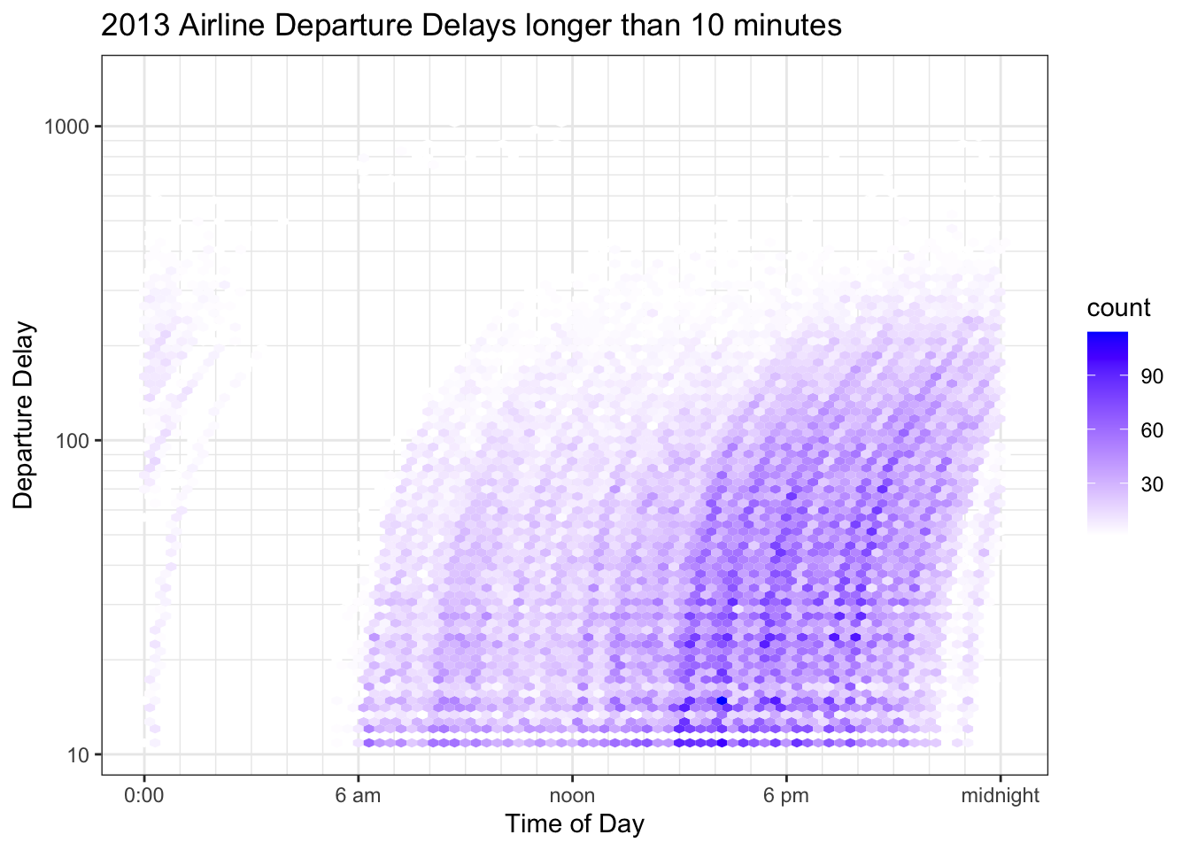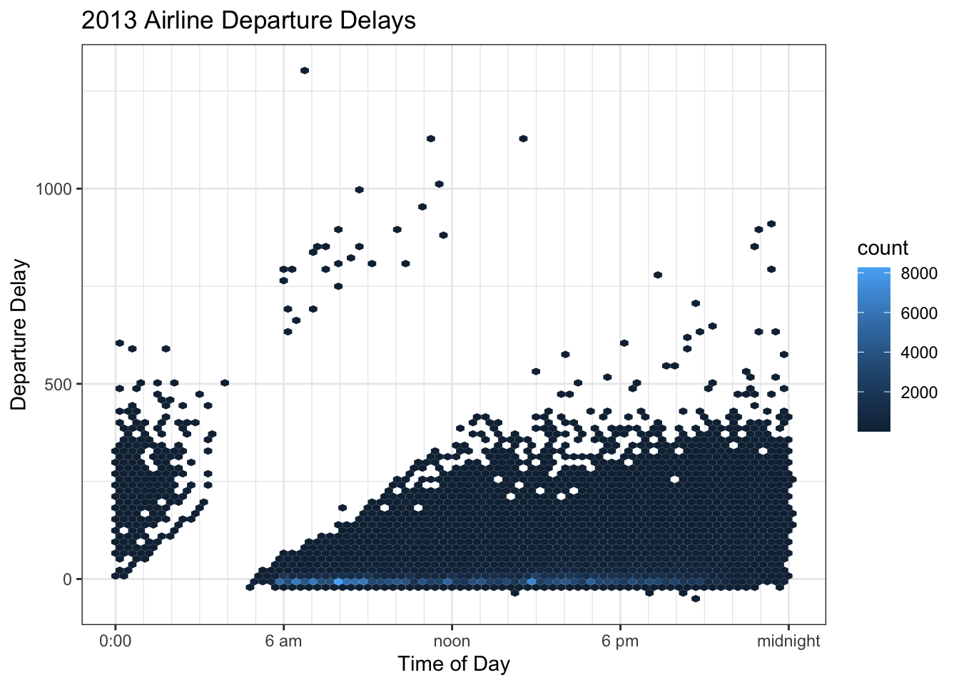 Wilke’s book uses and example of departure time of day versus the delay amount for all the flights out of New York City in 2013. The story to take home is that longer delays tend to happen later in the afternoon or evening rather than in the morning. Wilke uses these data to argue that over plotting is annoying and that a heat map can help out.