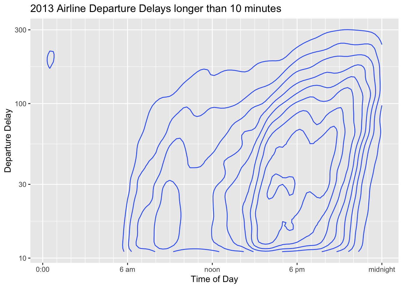 Contour plots are similar to density plots, but for two-axis. The lines mark out regions of similar probability and we read it similarly as a topological map that shows elevation. In this case we can see that the most frequent delays are around 30 minutes long and occur near 5 pm. There is also a local peak of 20 minute delays around 10 am.