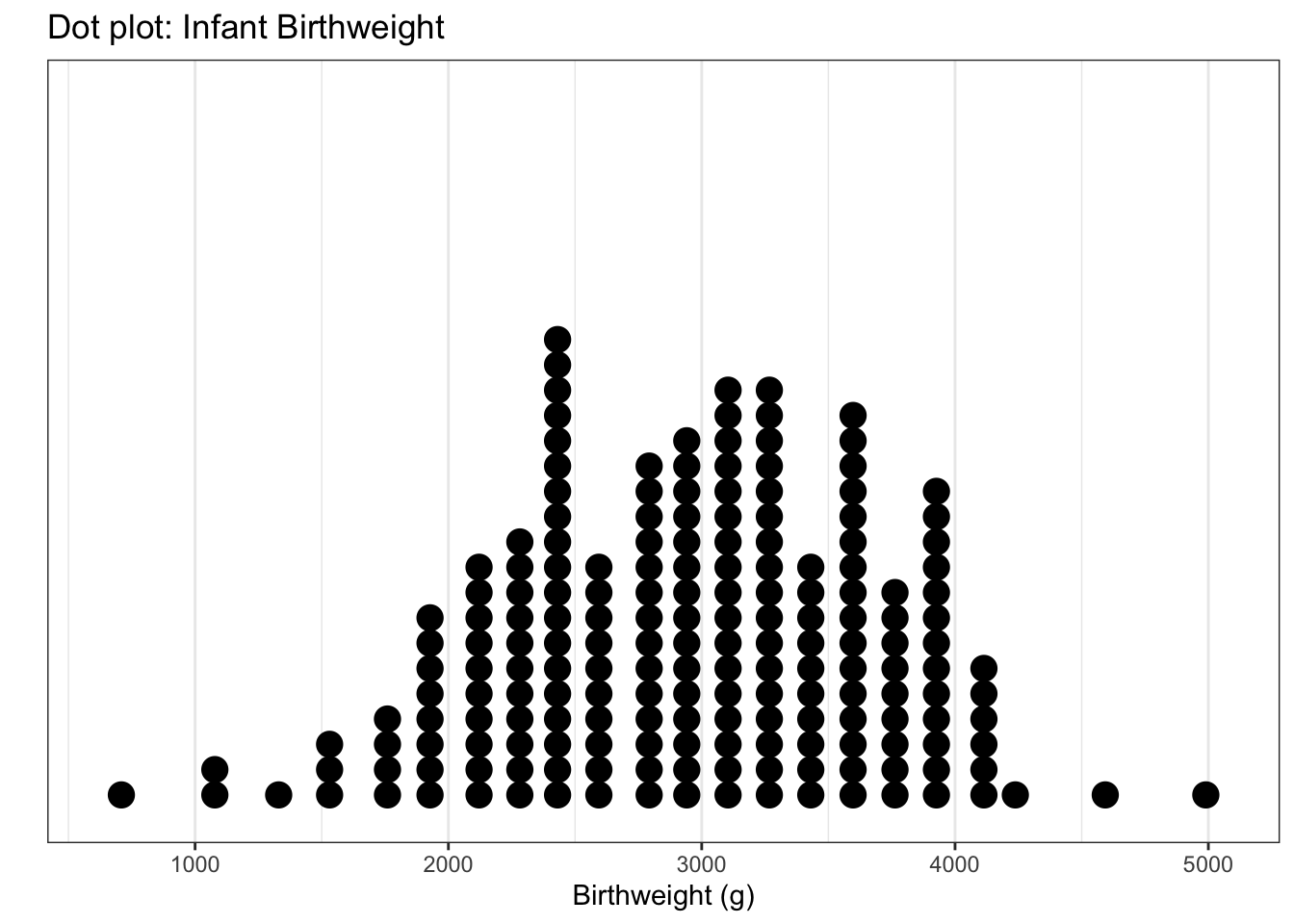When we have a moderate size of data, graphing dots exactly on an axis doesn’t work and results in over plotting and it is difficult to see where the data cluster. Instead we’ll stack the dots in columns along the axis and call this a dotplot.