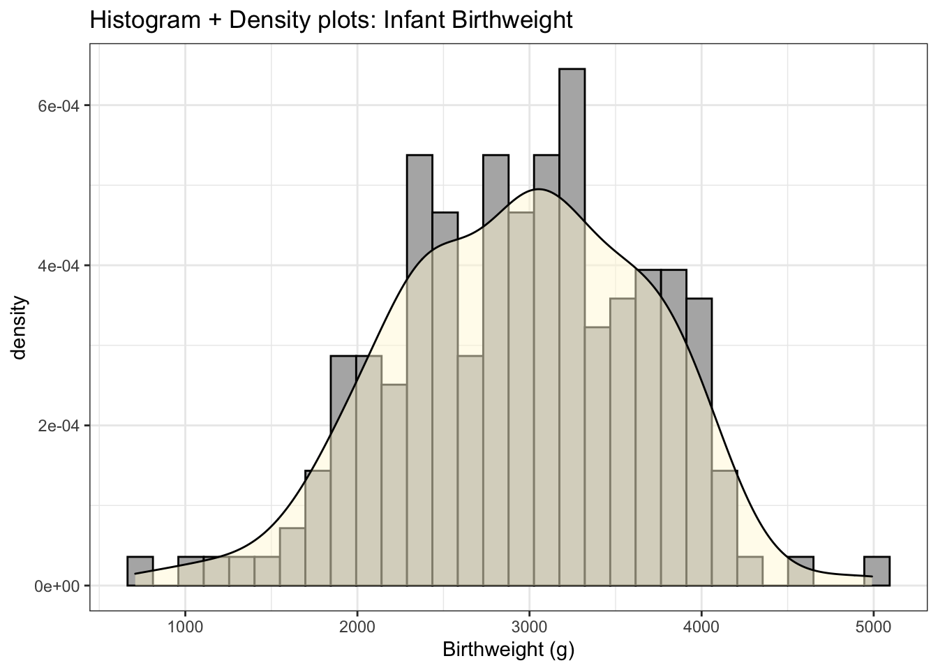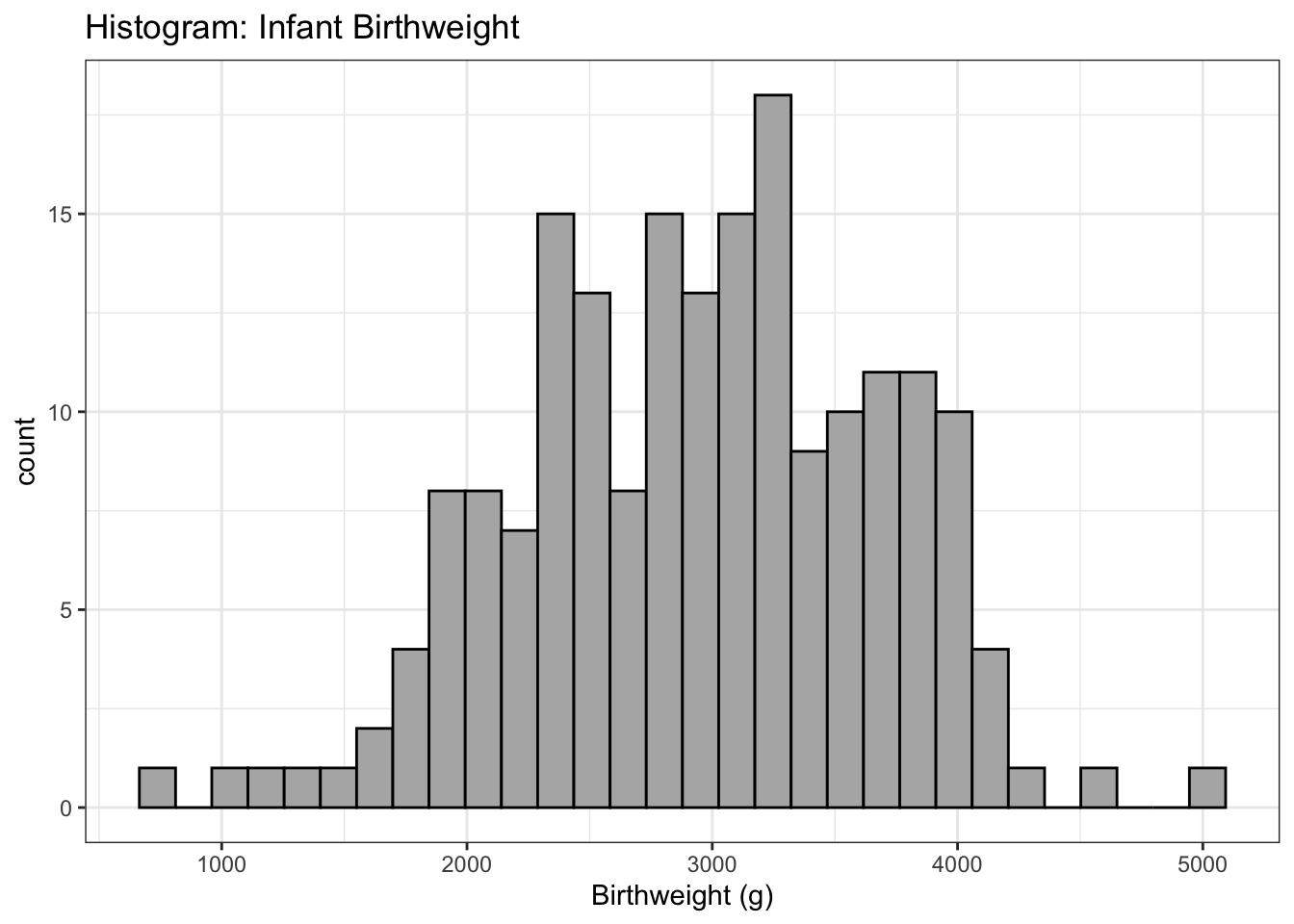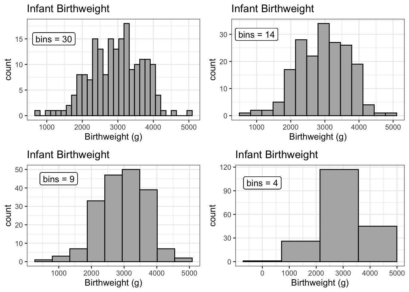 The choice of how many bins to include can make a dramatic difference in a graph. In particular, I don’t believe that there is any biological reason to think the dip near 2700 grams is real. I believe that is is actually just an artifact of the data I have. Instead we should consider changing the number of bins.