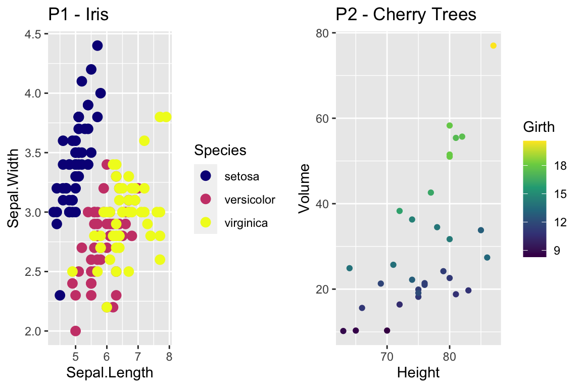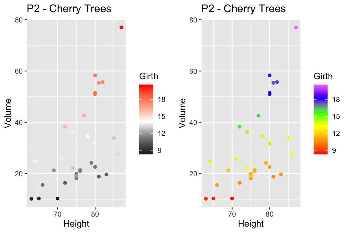 P2 <- ggplot(trees, aes(x=Height, y=Volume, color=Girth)) +