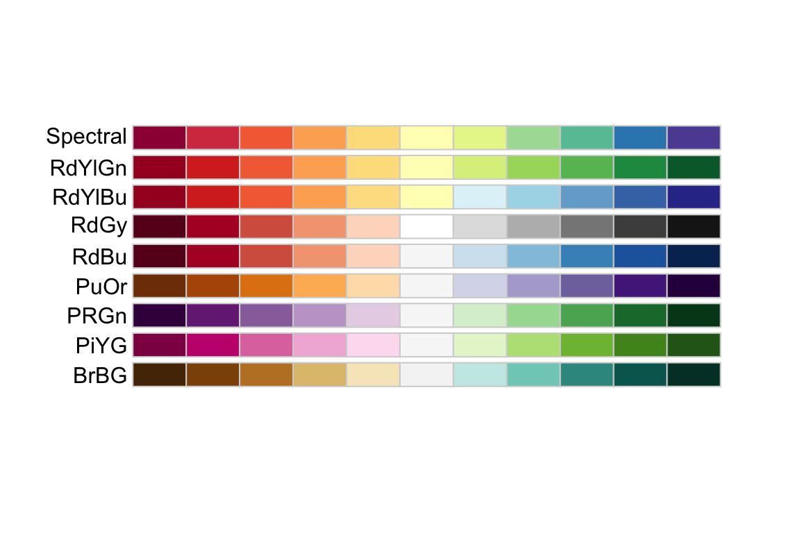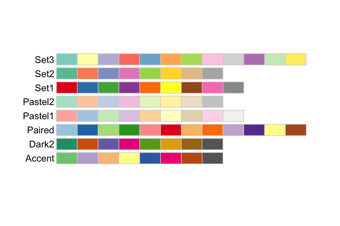 Using the ggplot::scale_XXX_brewer() functions, we can easily work with the