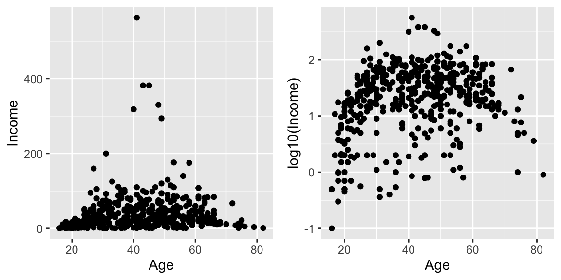 log10()transformation inside theaes()command. - Create the scatter plots using the