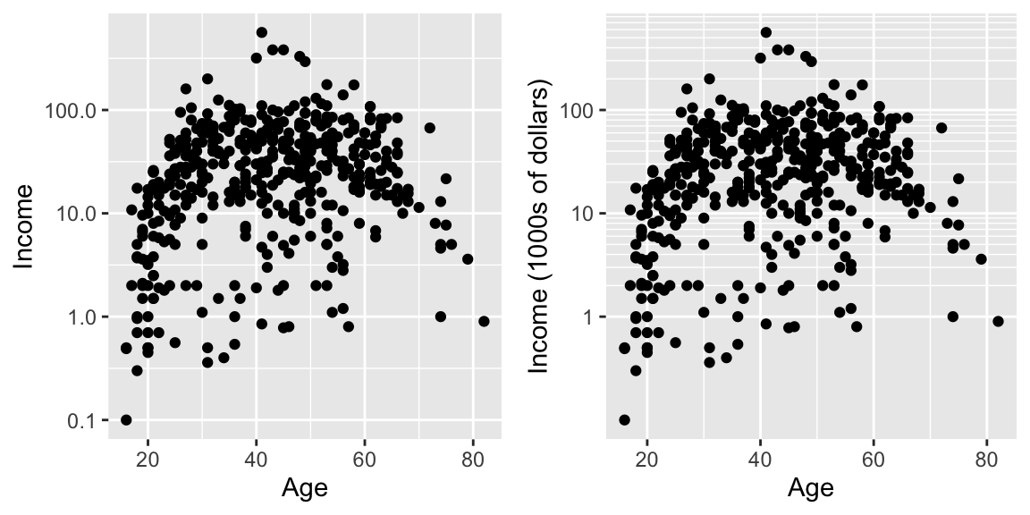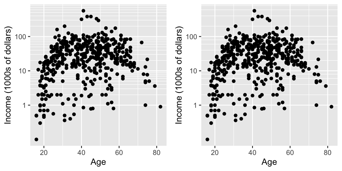 scale_x_log10()andscale_y_log10(). Set the major and minor breaks to be useful and aesthetically pleasing. Comment on which version you find easier to read. - The package