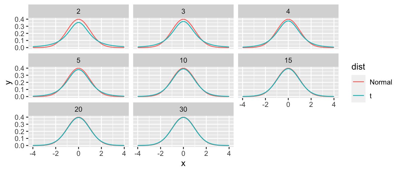 expand.gridfunction to create adata.framewith all combinations ofx=seq(-4,4,by=.01),dist=c('Normal','t'), anddf=c(2,3,4,5,10,15,20,30). Use thedplyr::mutatecommand with theif_elsecommand to generate the function heightsyusing eitherdt(x,df)ordnorm(x)depending on what is in the distribution column.expand.grid( x=seq(-4,4,by=.01), dist=c('Normal','t'), df=c(2,3,4,5,10,15,20,30) ) %>% mutate( y = if_else(dist == 't', dt(x, df), dnorm(x) ) ) %>% ggplot( aes( x=x, y=y, color=dist) ) + geom_line() + facet_wrap(~df)