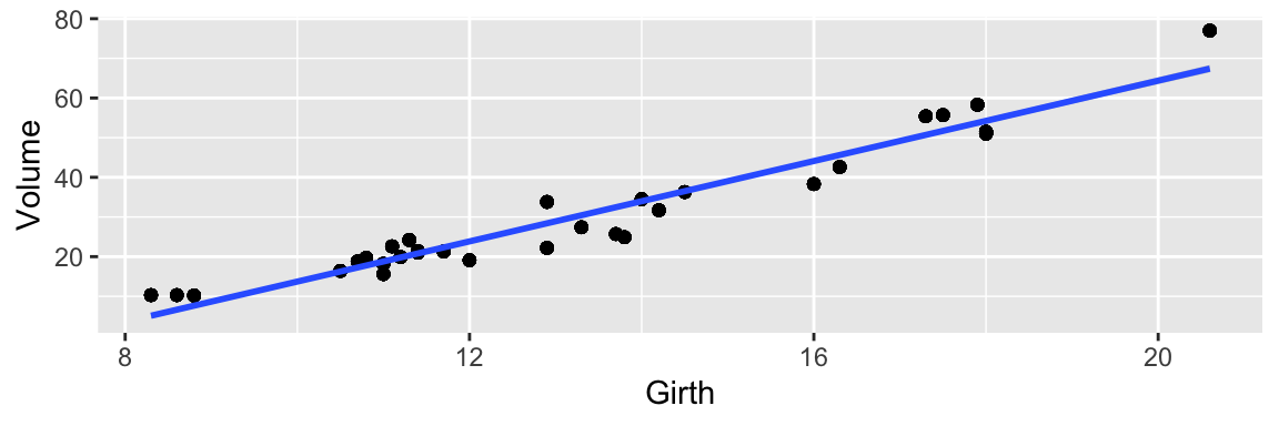 ggplot(trees, aes(x=Girth, y=Volume)) + geom_point() + geom_smooth(method='lm')## `geom_smooth()` using formula 'y ~ x'