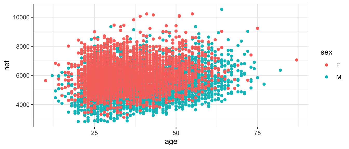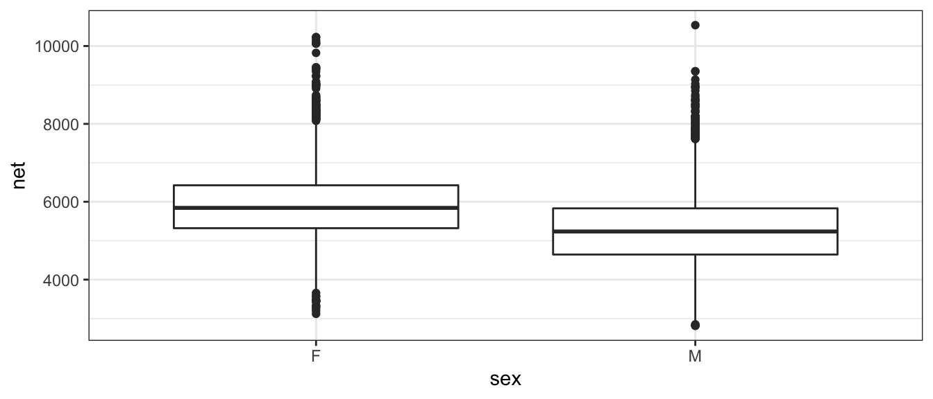 One final example showing how we can get information about grouped variables. Here, we would like to to calculate the same summary statistics as above, but would like to know them specificall for each factor with sex; that is, we want to compare ‘Male’ and ‘Female’.