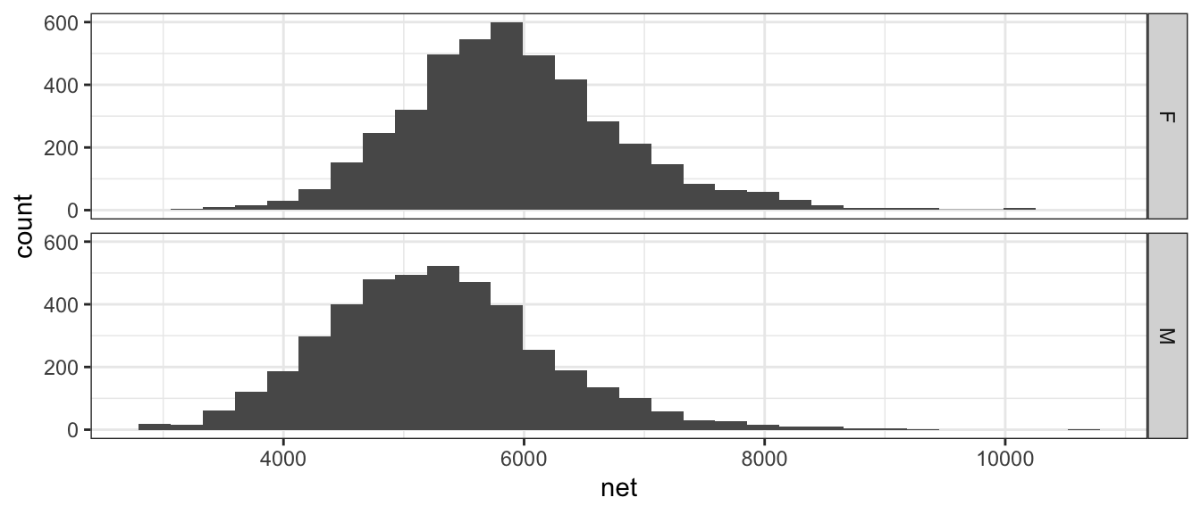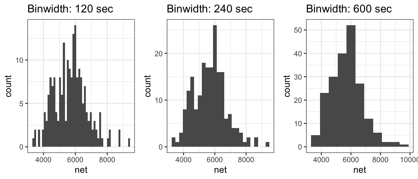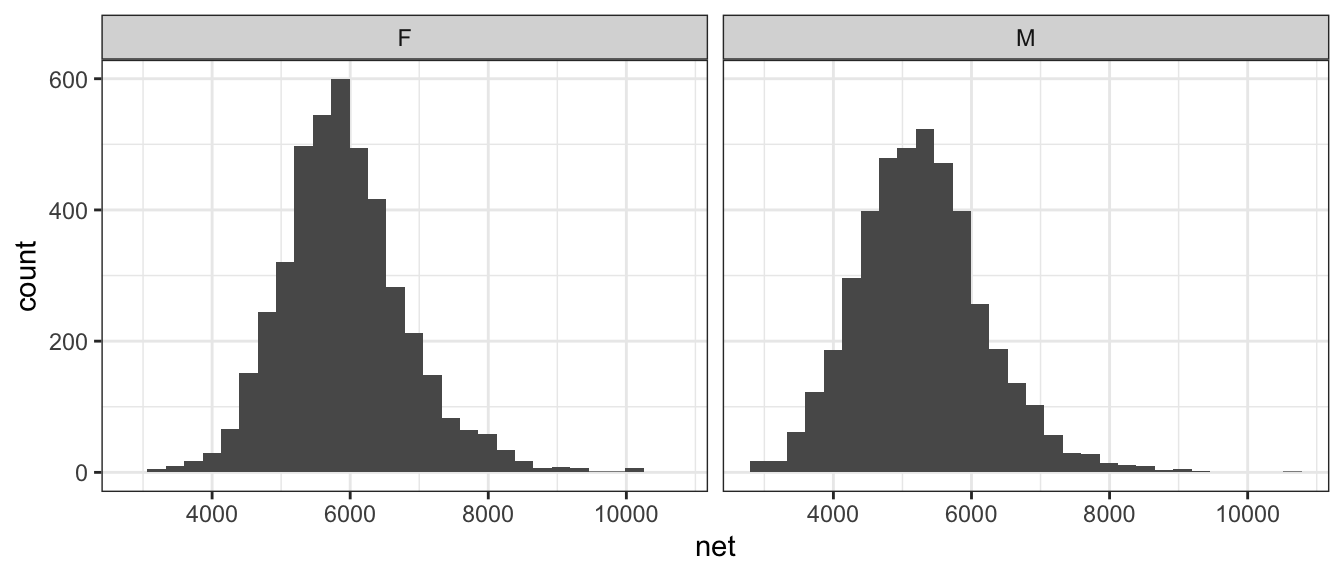 theme_set(theme_bw())For this chapter, we will consider data from a the 2005 Cherry Blossom 10 mile run that occurs in Washington DC. This data set has 8636 observations that includes the runners state of residence, official time (gun to finish, in seconds), net time (start line to finish, in seconds), age, and gender of the runners.