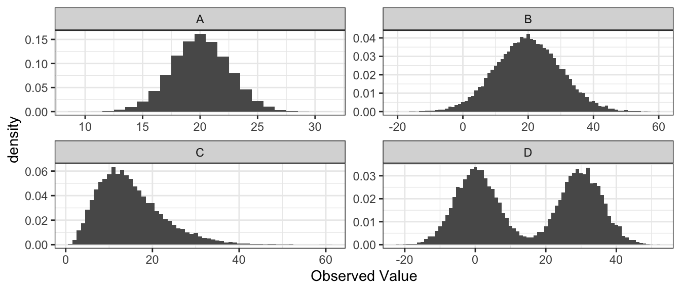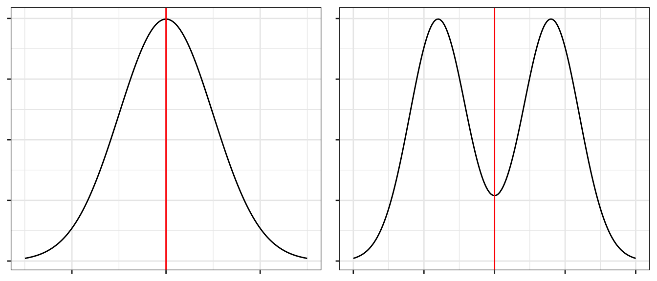 A distribution is said to be symmetric if there is a point along the x-axis (which we’ll call \(\mu\)) which acts as a mirror. Mathematically, a distribution is symmetric around \(m\) if and only if \(f( -\lvert x-\mu \rvert ) = f( \lvert x-\mu \rvert )\). The following graphs give the point of symmetry marked with a red line.
