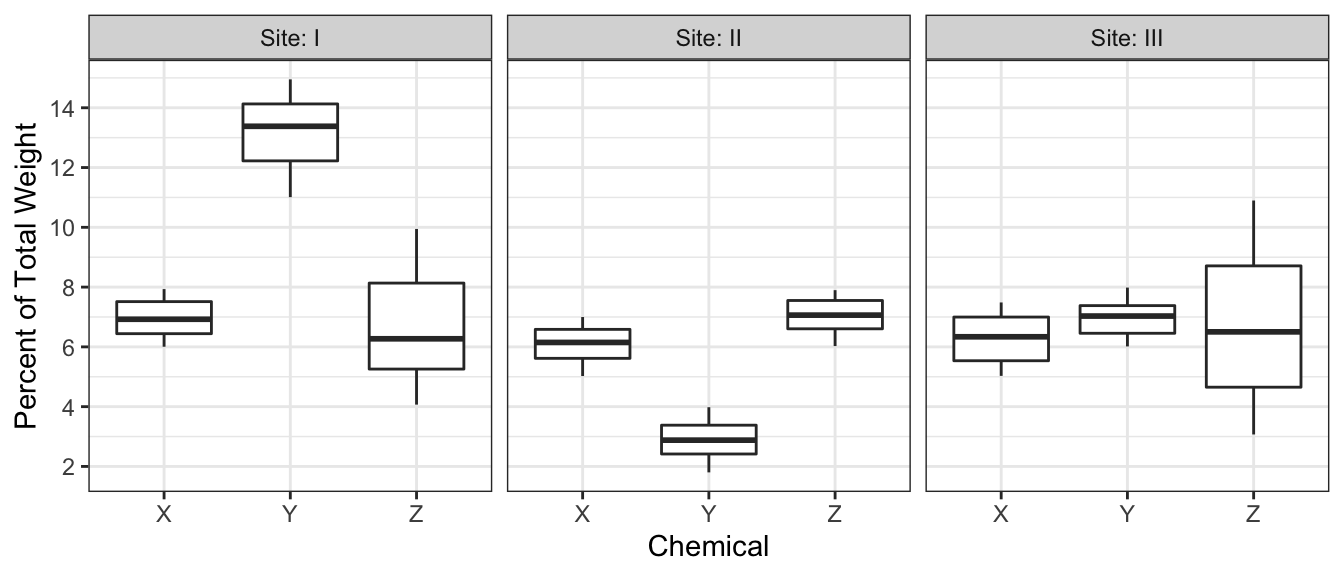 The chemicals in clay used to make pottery can differ depending on the geographical region where the clay originated. Sometimes, archaeologists use a chemical analysis of clay to help identify where a piece of pottery originated. Such an analysis measures the amount of a chemical in the clay as a percent of the total weight of the piece of pottery. The box plots below summarize analyses done for three chemicals—X, Y, and Z—on pieces of pottery that originated at one of three sites: I, II, or III.