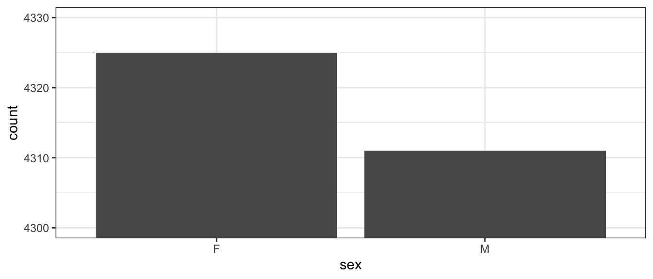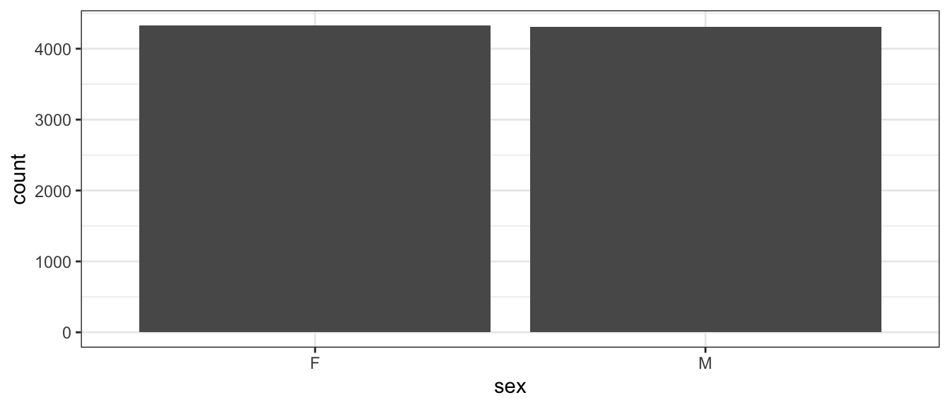 And if we do this sub-sampling, then our sample proportions will necessarily be the same as our population proportions. This can have desirable consequences, mainly that stratifying ensures samples are taken from all potential sources, here the sources are the different categories within our sex variable. If I did draw samples using only SRS with no stratifying, I might get proportions of ‘Male’ and ‘Female’ that are wildly different than the original sample, and stratification forces us to not select those unrepresentative samples. Stratifying guarantees we reproduce the proportions, while sampling from all homogeneous groupings.