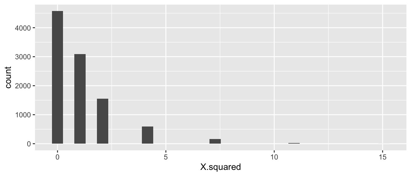 Similarly to the two-sample t-test, we randomly shuffle the treatment assignments and recalculate the statistic many times and examine the sampling distribution of our test statistic, \(X^{2}\).