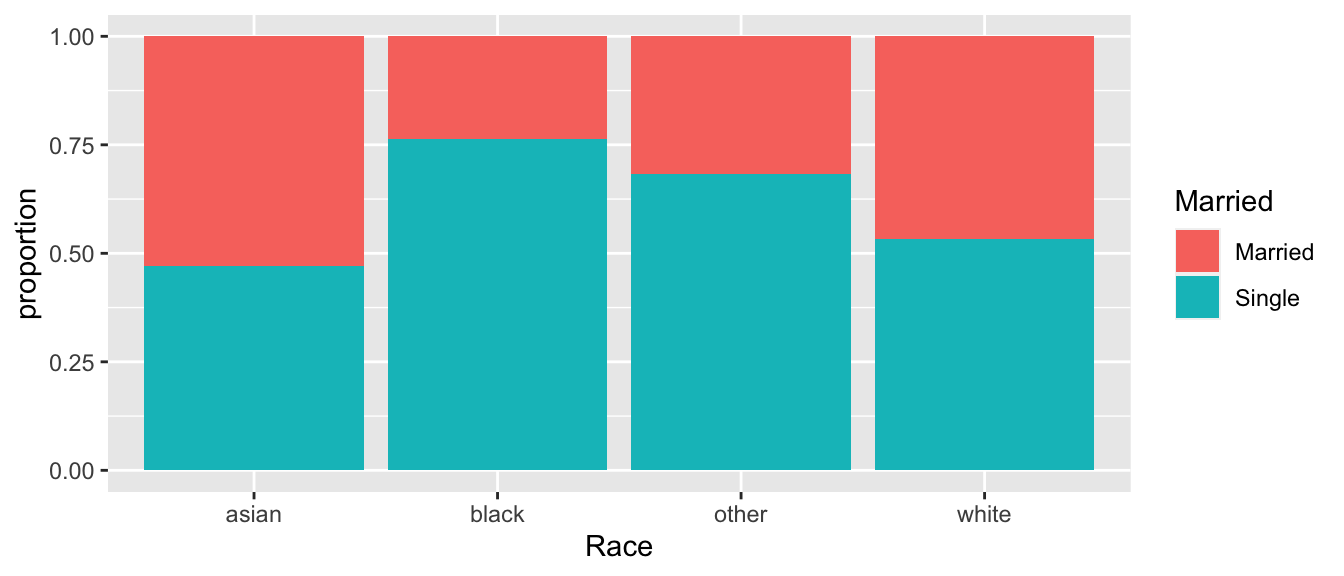 There are a number of other questions that I might consider, such as confidence intervals for the proportions married in each race. However, those questions require a few more assumptions about the structure of the data and will be addressed when we study logistic regression.