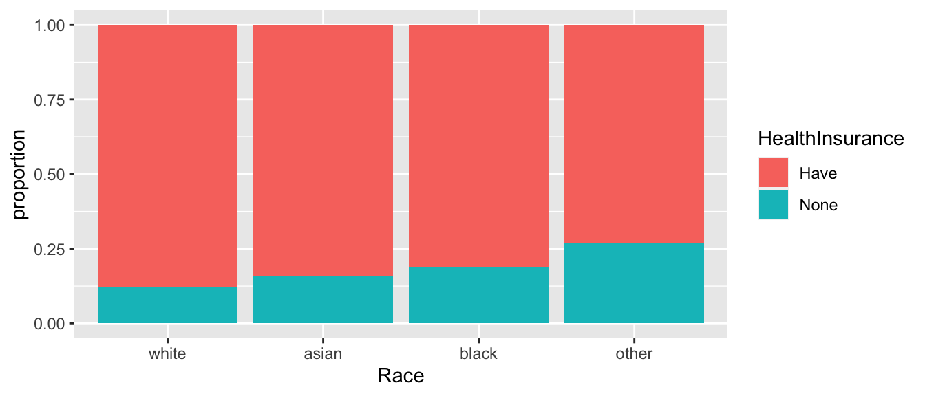 Lock5Datahas a dataset,ACS, which is a sub-sample of \(n=1000\) respondents of that 2010 survey. In particular, we want to examine the relationship between race and having health insurance.data(ACS, package='Lock5Data') temp <- ACS %>% mutate(HealthInsurance = factor(ifelse(HealthInsurance == 1, "Have","None")), Race = factor(Race, levels=c('white','asian','black','other') ) ) %>% group_by(Race, HealthInsurance) %>% dplyr::count() %>% group_by(Race) %>% mutate(proportion = n/sum(n)) ggplot(temp, aes(x=Race, y=proportion, fill=HealthInsurance)) + geom_bar(stat='identity')