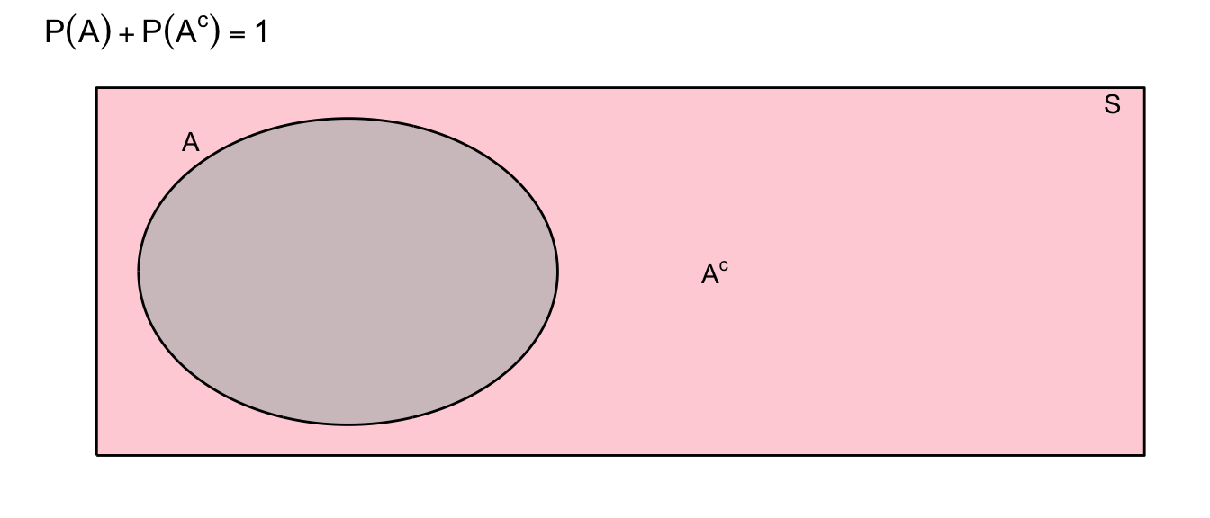 This rule follows from the partitioning of the set of all events (\(S\)) into two disjoint sets, \(A\) and \(A^c\). We learned above that \(A \cup A^c = S\) and that \(P(S) = 1\). Combining those statements, we obtain the complement rule.